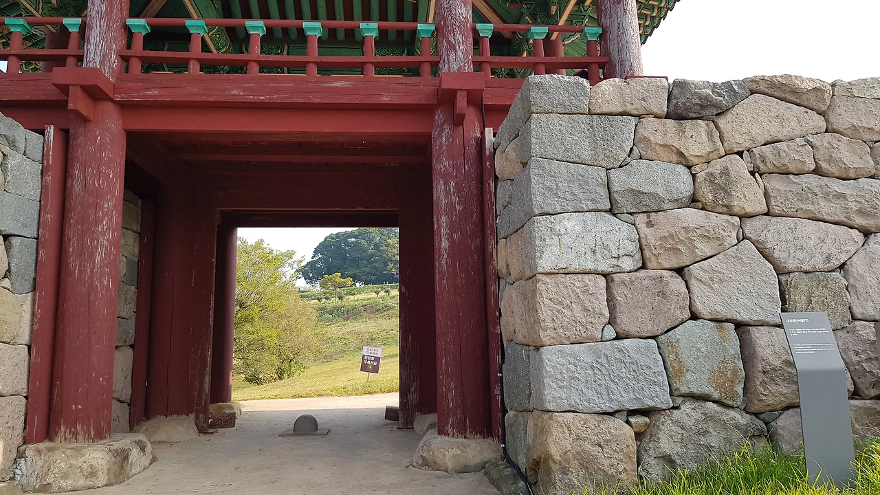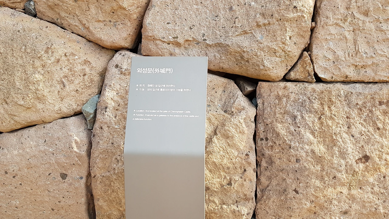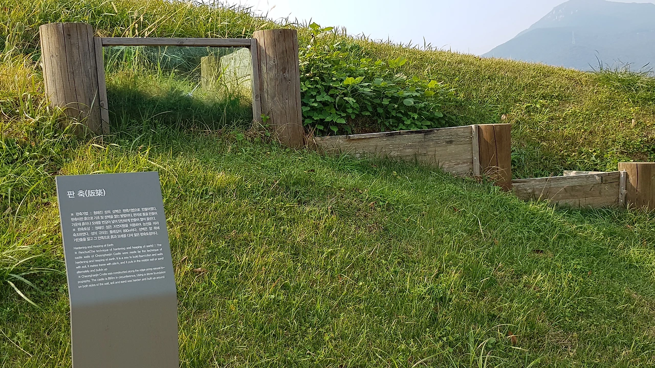 외성문으로 입성하니 성 위쪽에성을 쌓은 틀을 비치했는데 판자로 틀을 만들어 흙과 모래등을 번갈아 넣어 단단하게 만들어 성을 쌓았다는 판촉기법을 알리고 있었다