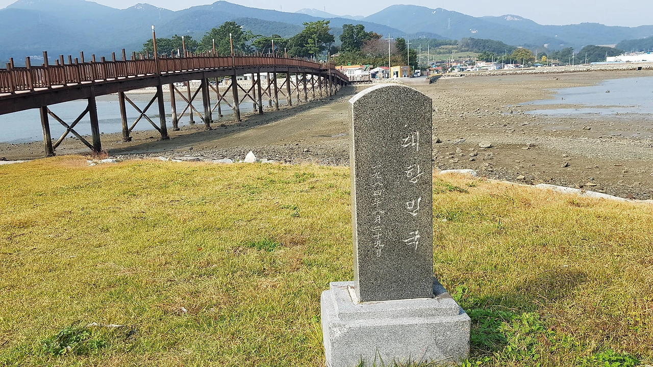 다리를 건너자 입구를지키는 비석에 장도 청해진 유적 이란 글과 뒤쪽에는 대한민국이라는 글이 쓰여 있었다