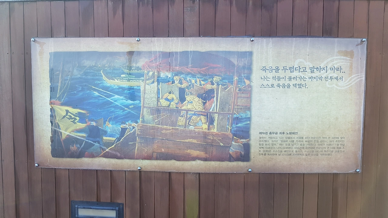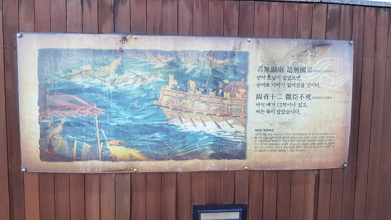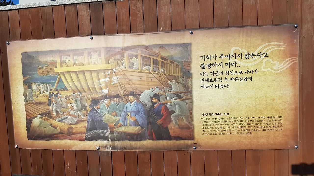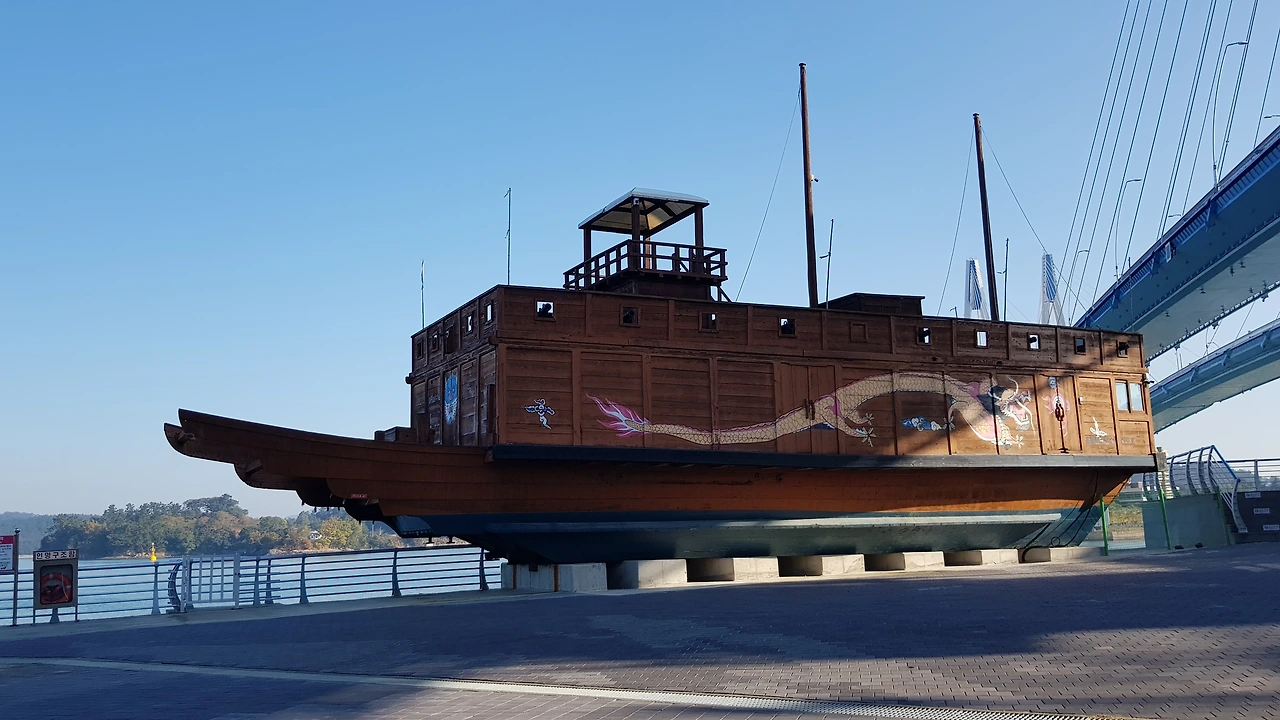바닷물이 찰랑거리는 위를 걷다 보니 한쪽에 주말장터에 문이 닫힌 가게 서너 곳이 있었고 그 옆으로 장군께서 지휘를 하셨던 판옥선이 비치되어 있었다