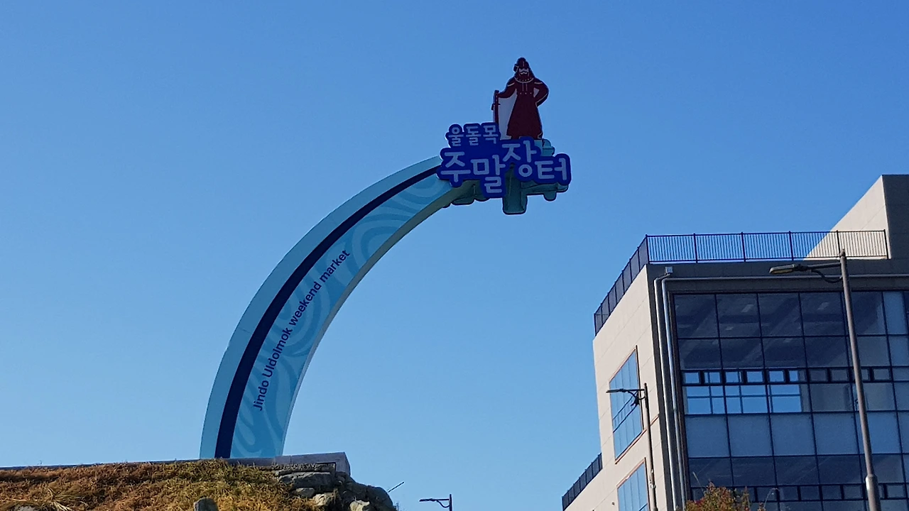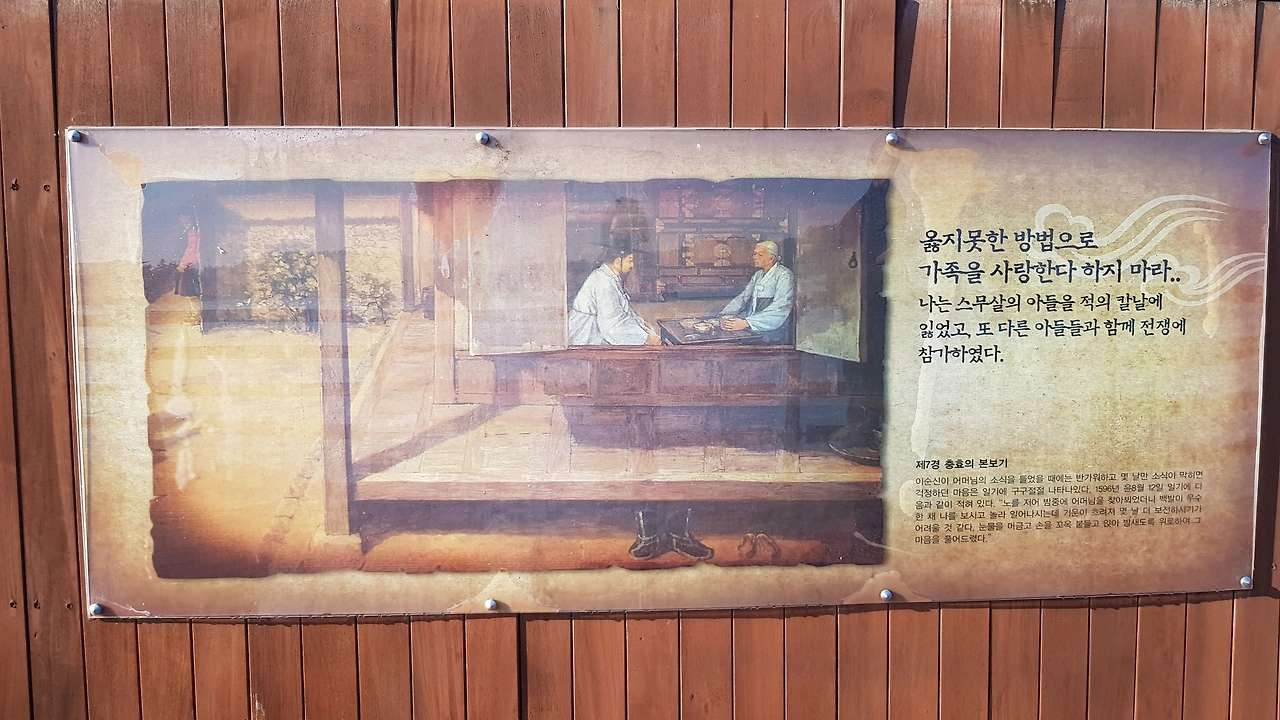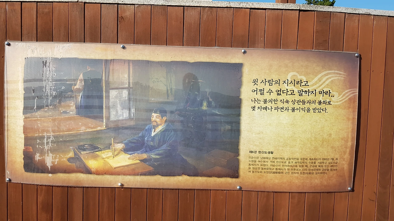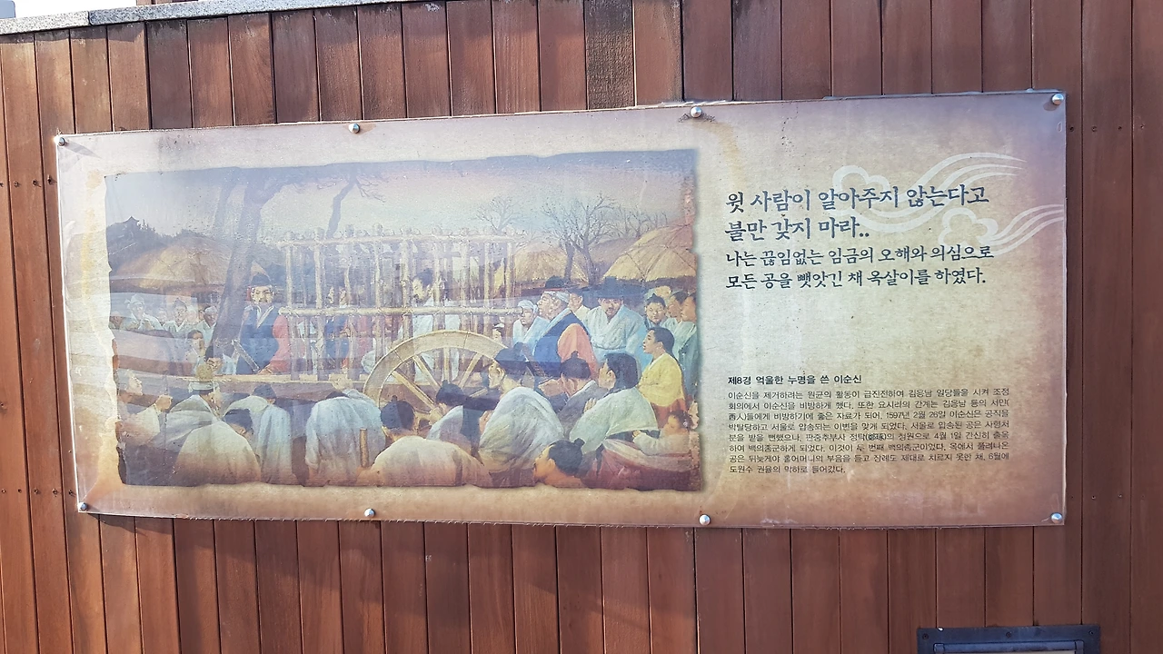 바닷물이 찰랑거리는 위를 걷다 보니 한쪽에 주말장터에 문이 닫힌 가게 서너 곳이 있었고 그 옆으로 장군께서 지휘를 하셨던 판옥선이 비치되어 있었다