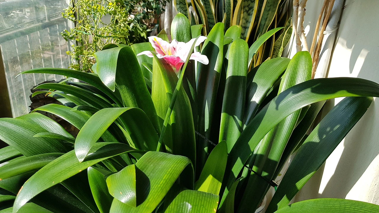핑크빛 꽃 한 송이 안고 있는 군자란