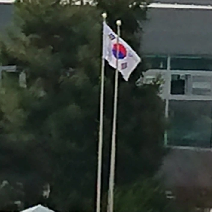 국기게양대 꼭대기에 깨끗하고 새하얀 국기가 펄럭이고 있다