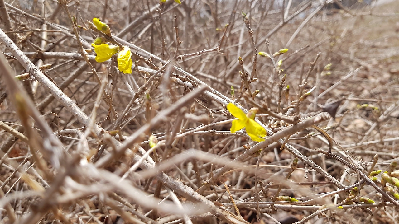아주 여린 개나리꽃 찾았다 한송이를