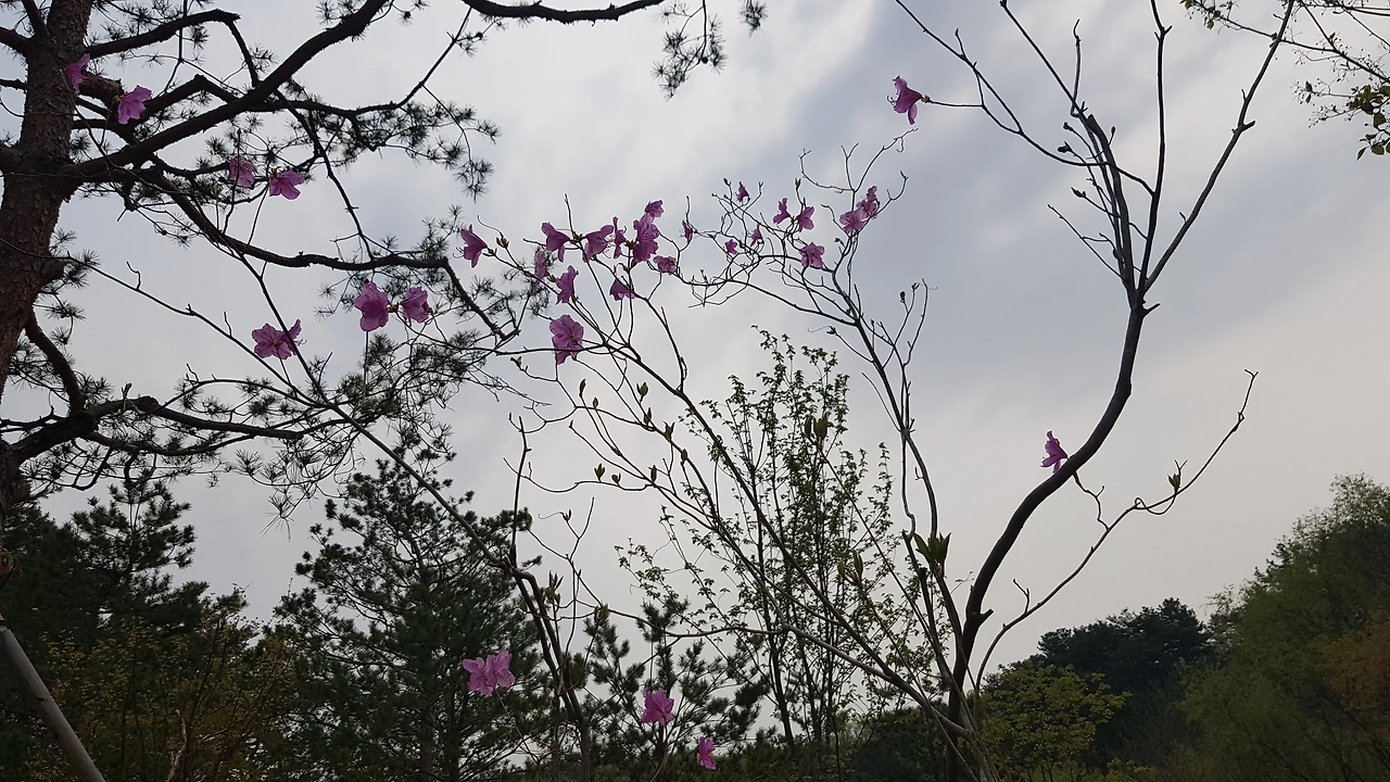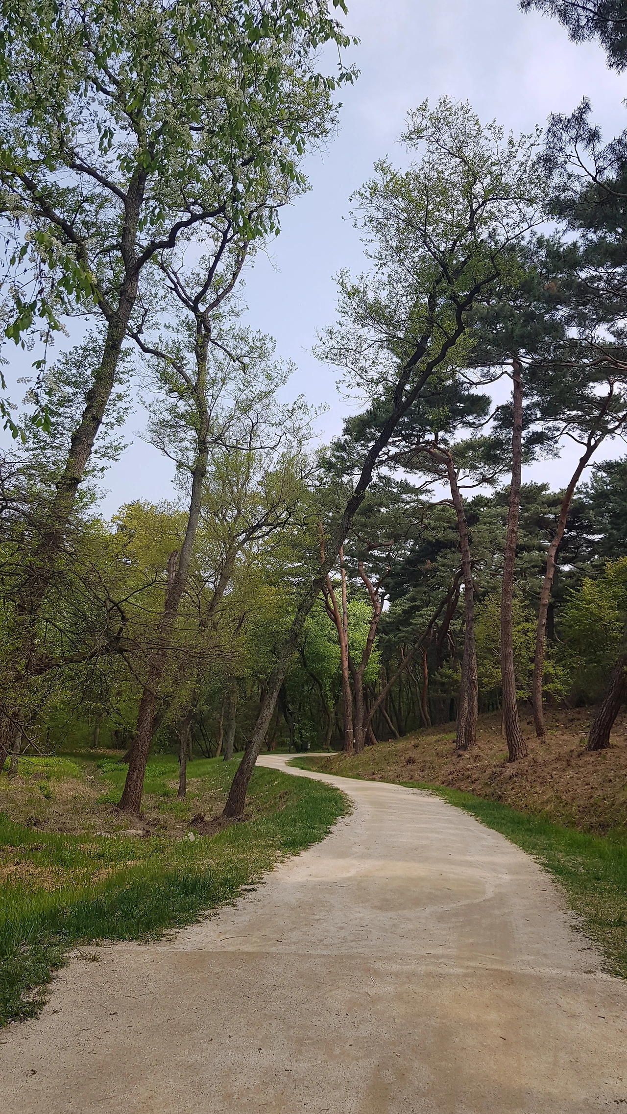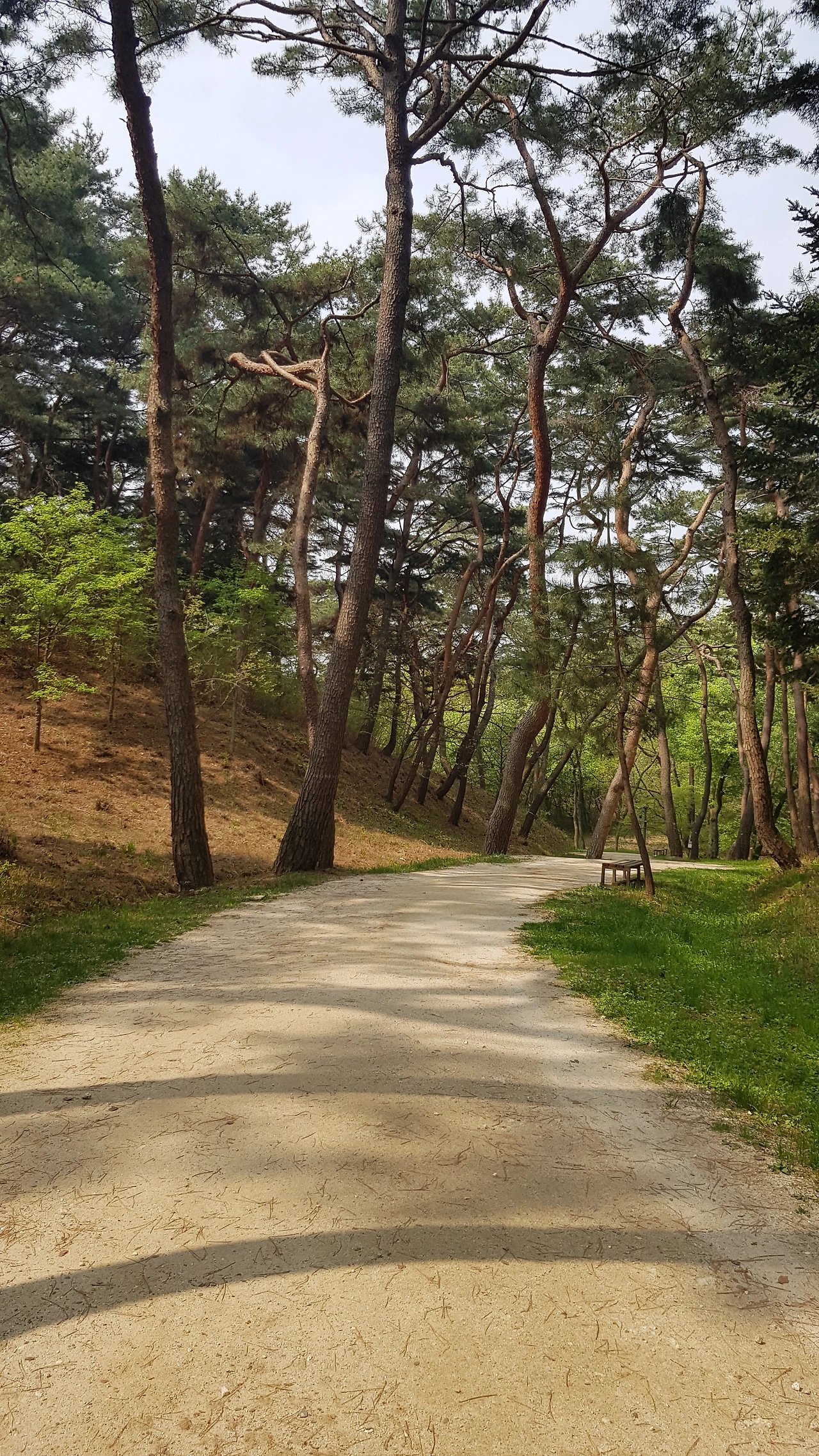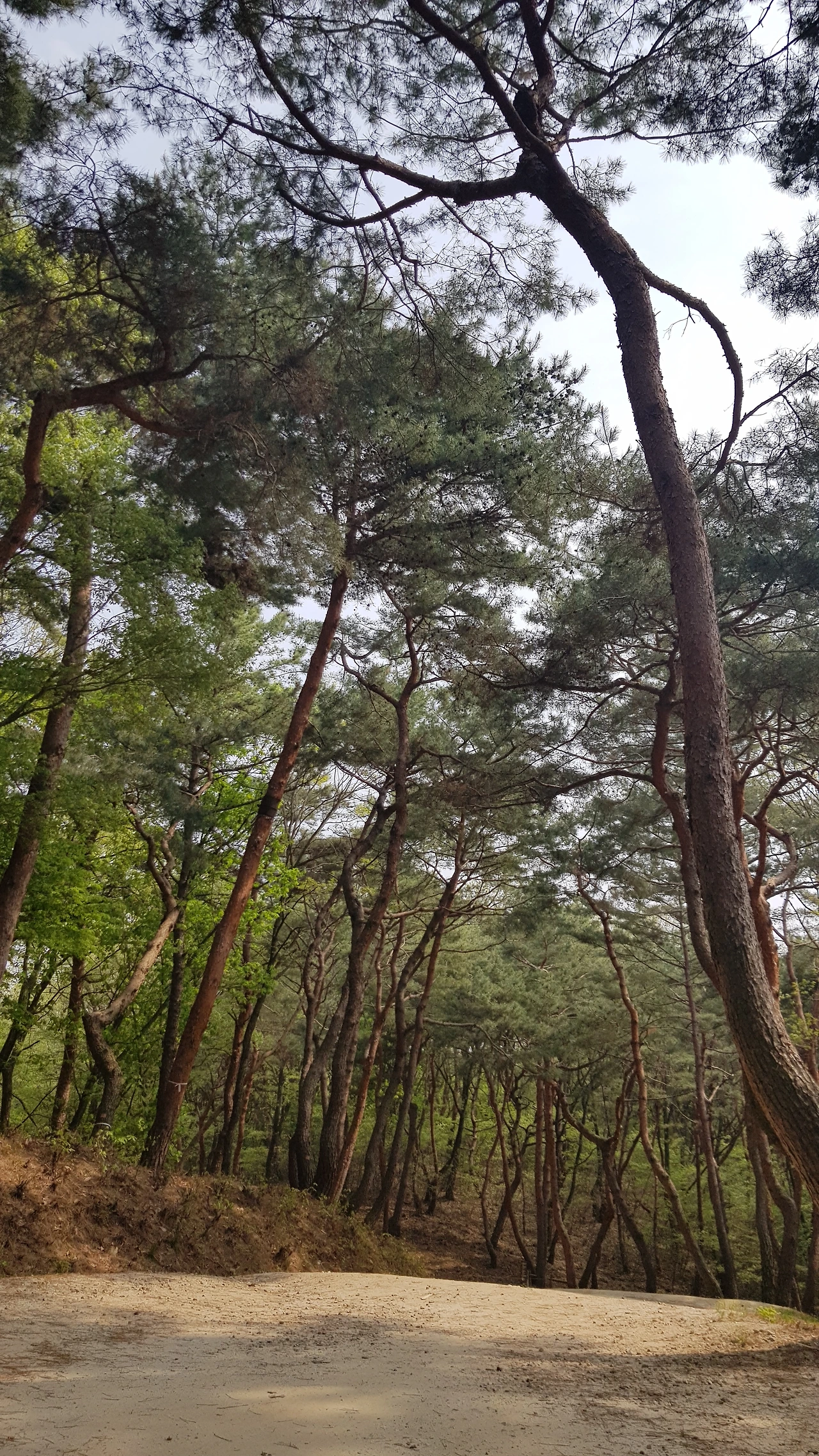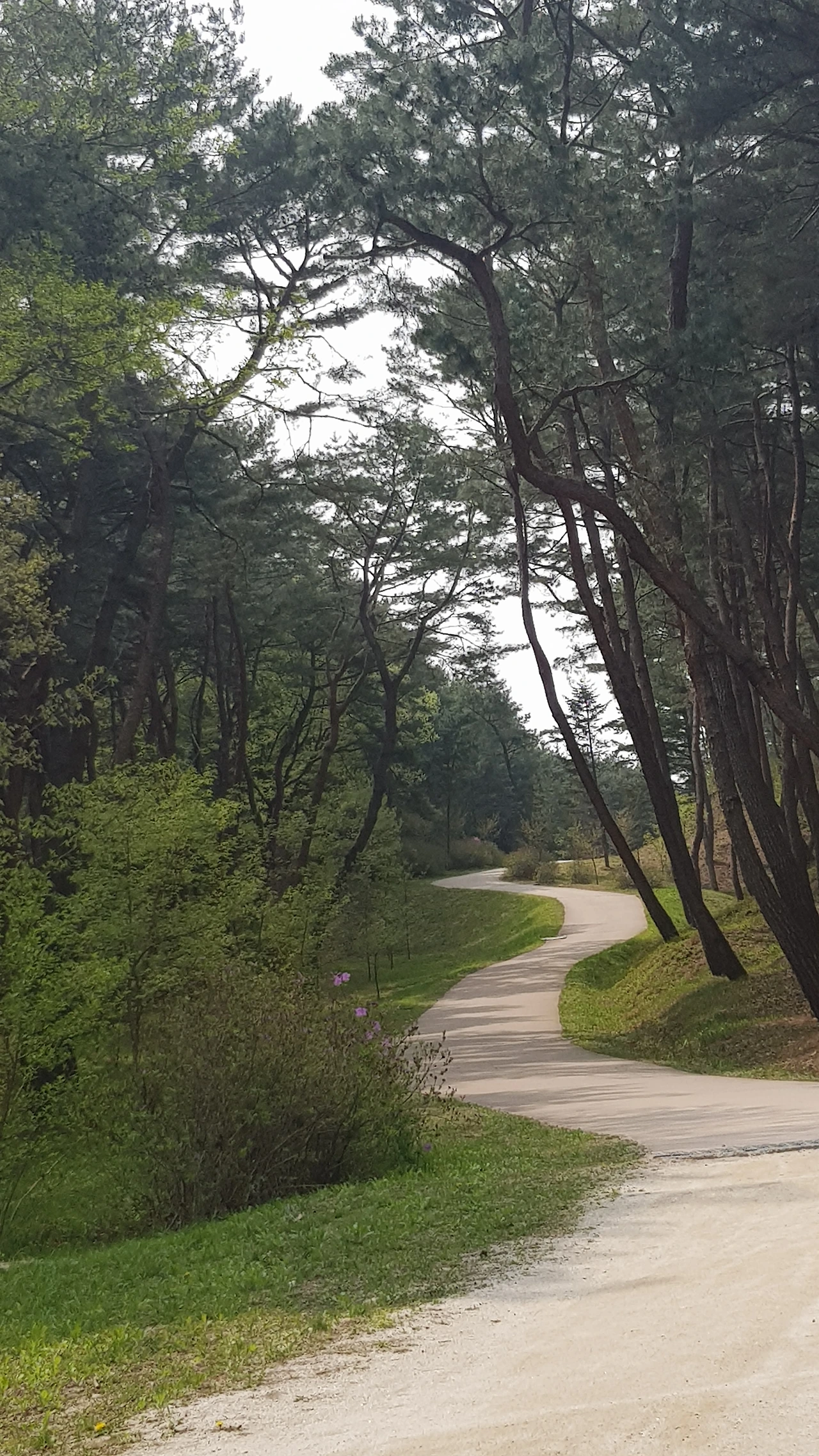 세종대왕릉 옆길에서 시작된 이름 모를 큰 키의 우거진 하얀 봄꽃 나무 군락이 너무도 아름다웠으며 길 양옆으로 우거진 소나무가