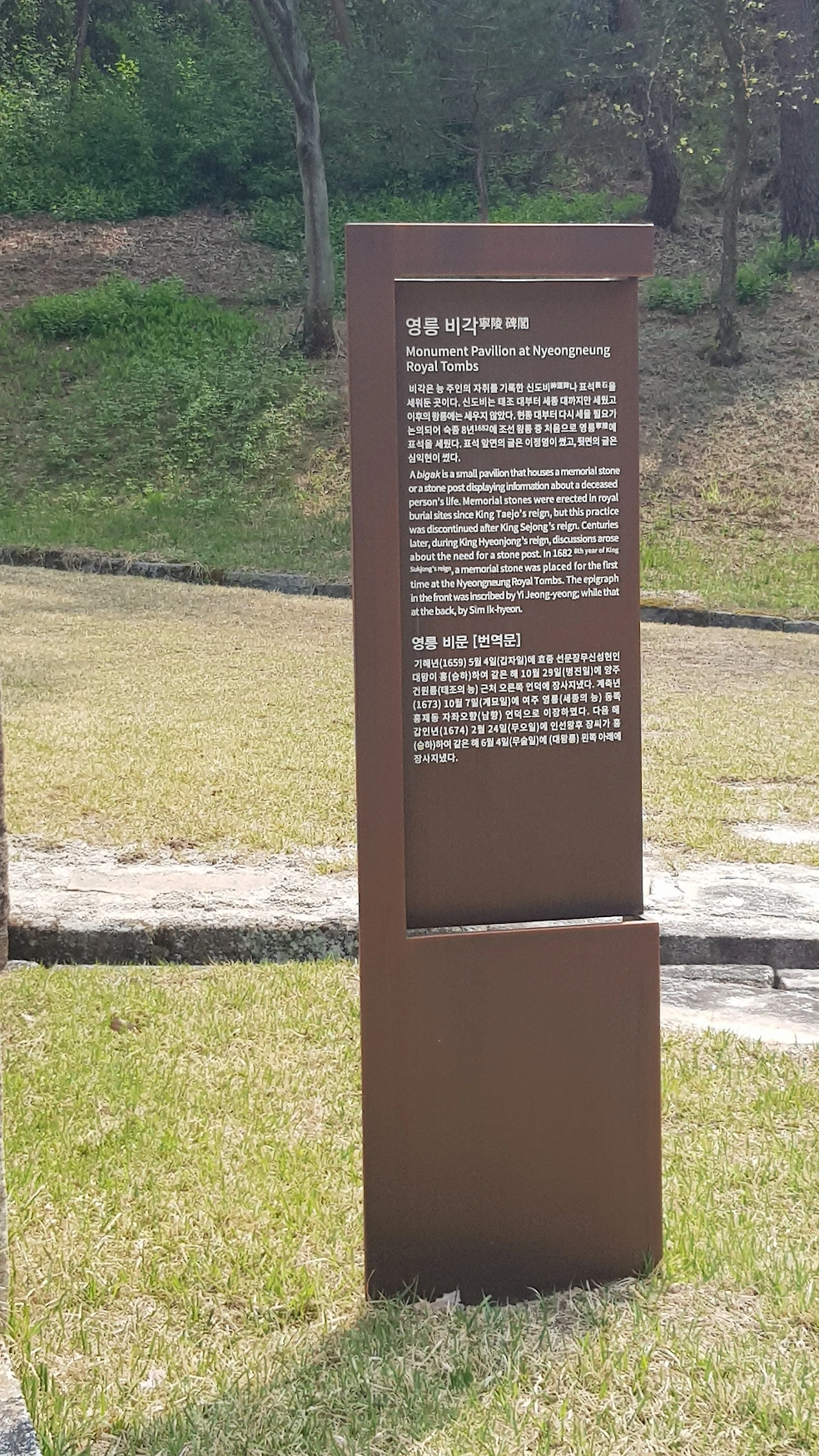 어쩌면 이 거대 나무들과 온몸이 잘렸지만 죽지 않고 살아있다고 외치는 저 나무까지도 북벌의 꿈을 눈앞에 두고 갑자기 세상을 떠난 효종의 큰 뜻을 애도하고 있나 보다 애잔함에 다시 돌아다보며 효종의 기막힌 인생사를 마음에 담고 세상사 참 뜻대로 되기 어렵구나라는 안타까움을 안고 발길을 돌렸다.