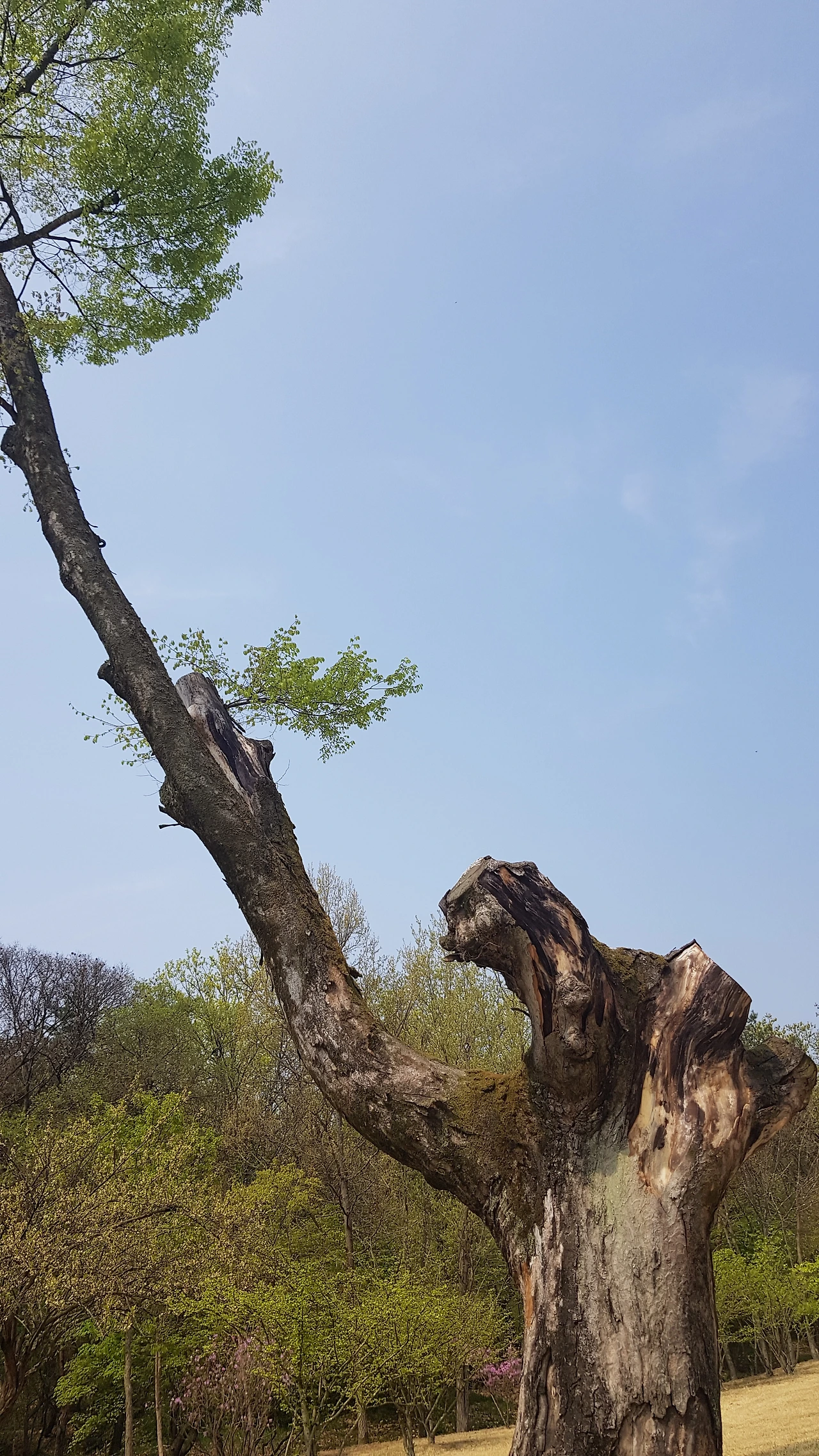잘린 몸통에 한쪽 팔을 높이 들고 파란 잎을 보이며 살아있음을 알리고 있는 나무의 모습이었다