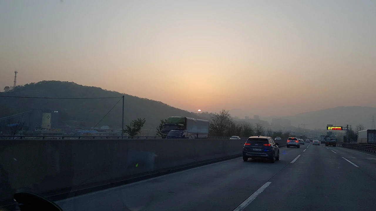 차는 달려 제2영동 고속도로에 접어드는데 해님이 얼굴 내밀며 일찍부터 여행 가느냐며