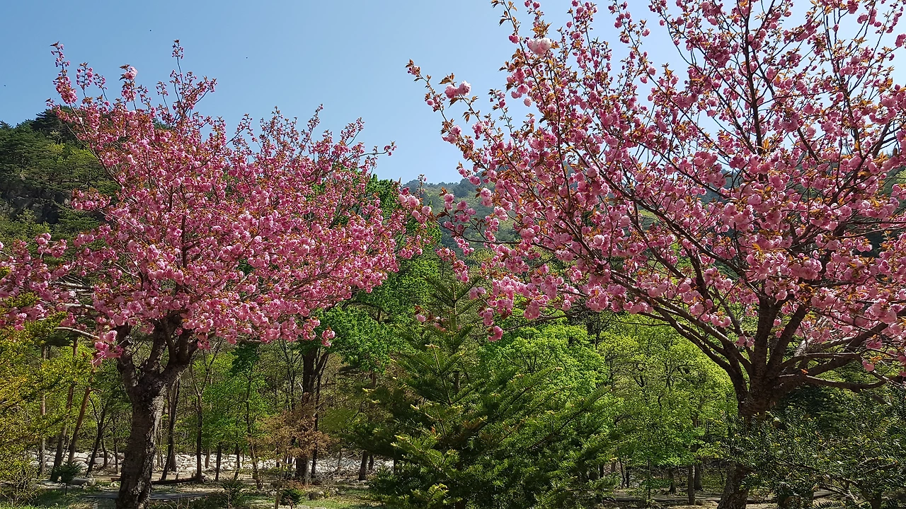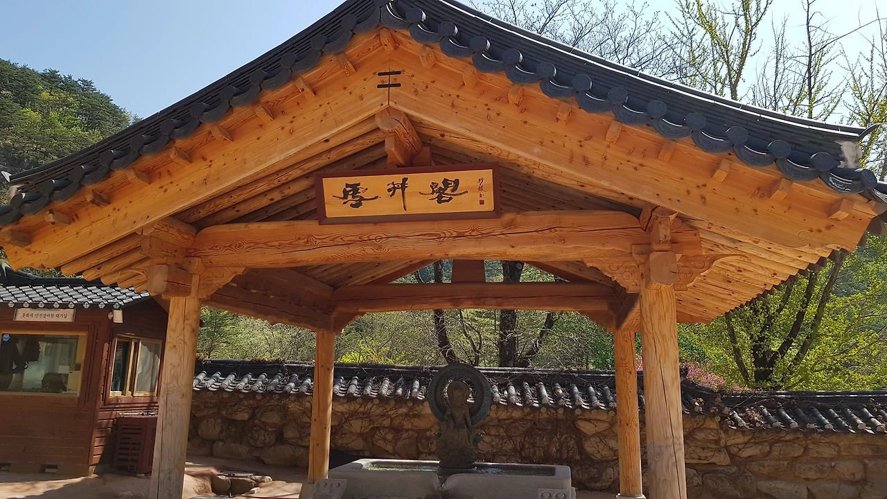 신흥사 입구에는 접 벚꽃이 흐드러지게 피어있고 돌담을 따라 설악산 신흥사의 일주문에 발을 들여놓았다
