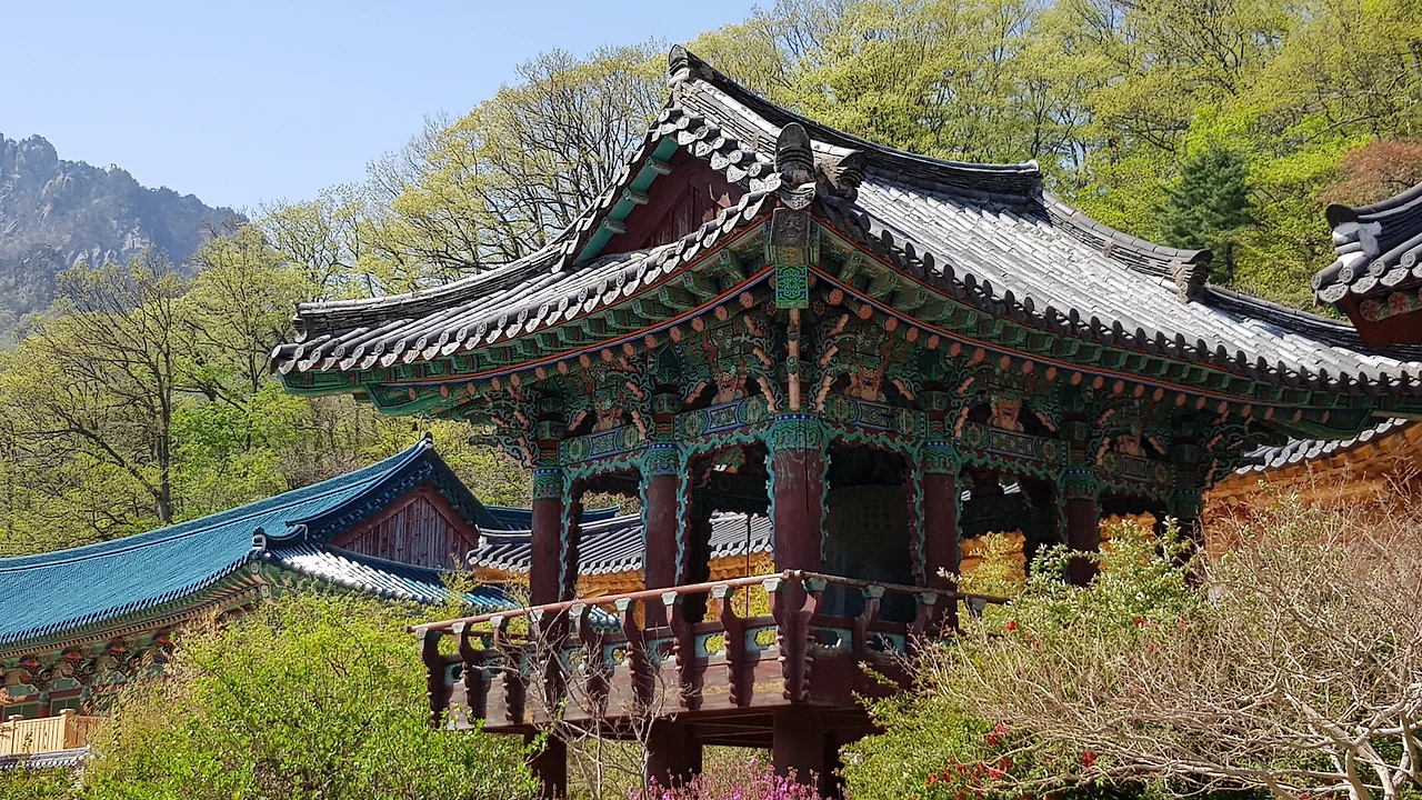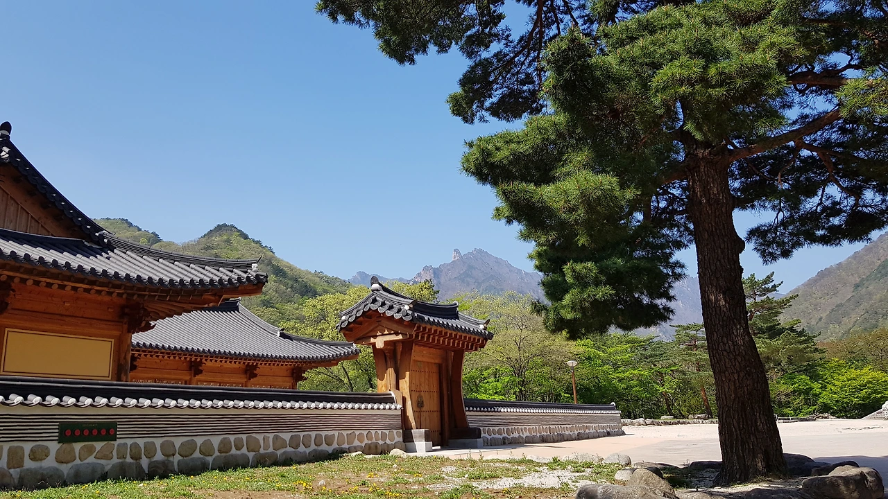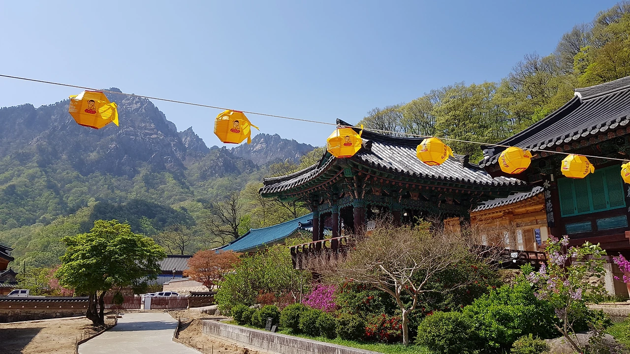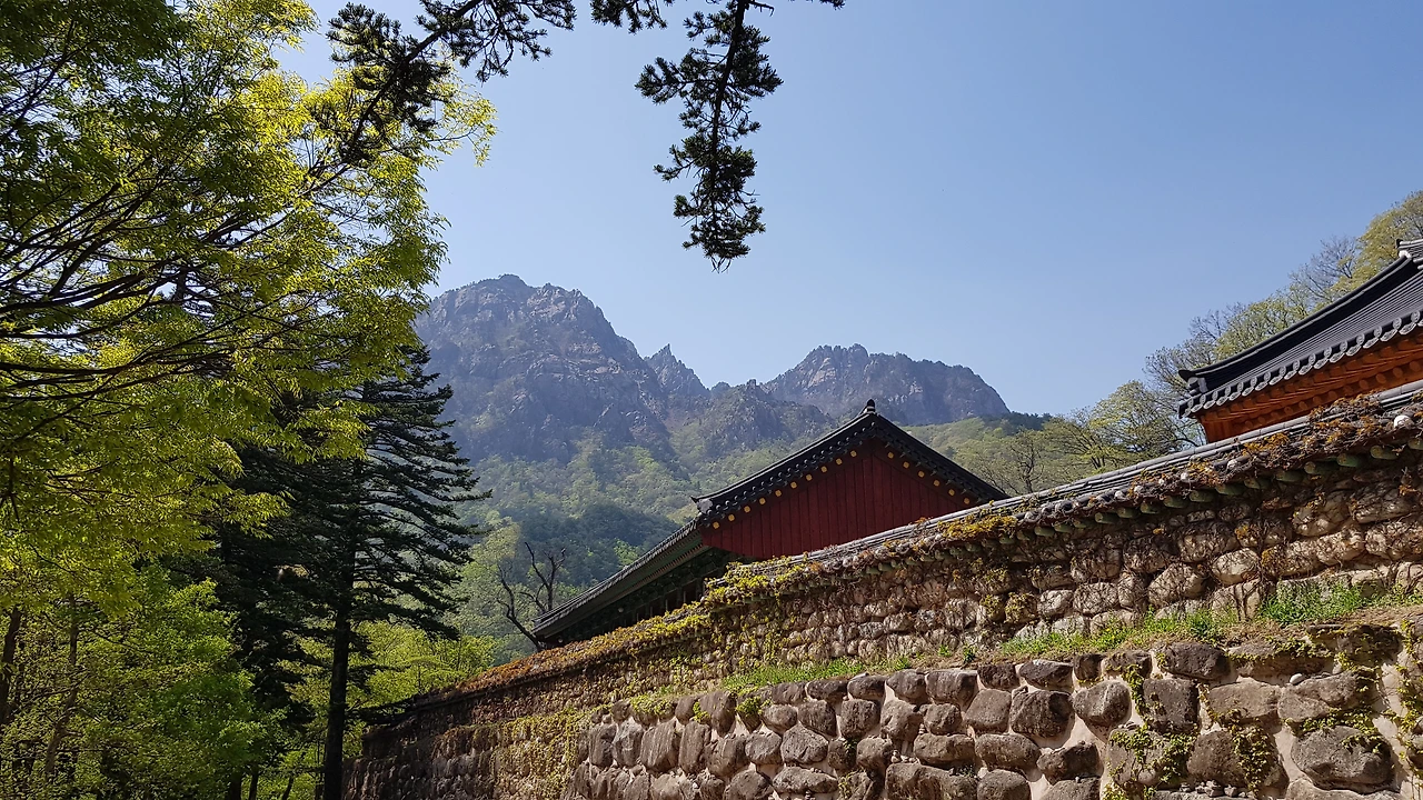 사찰의 지붕과 하나 되는 설악산의 어우러짐,