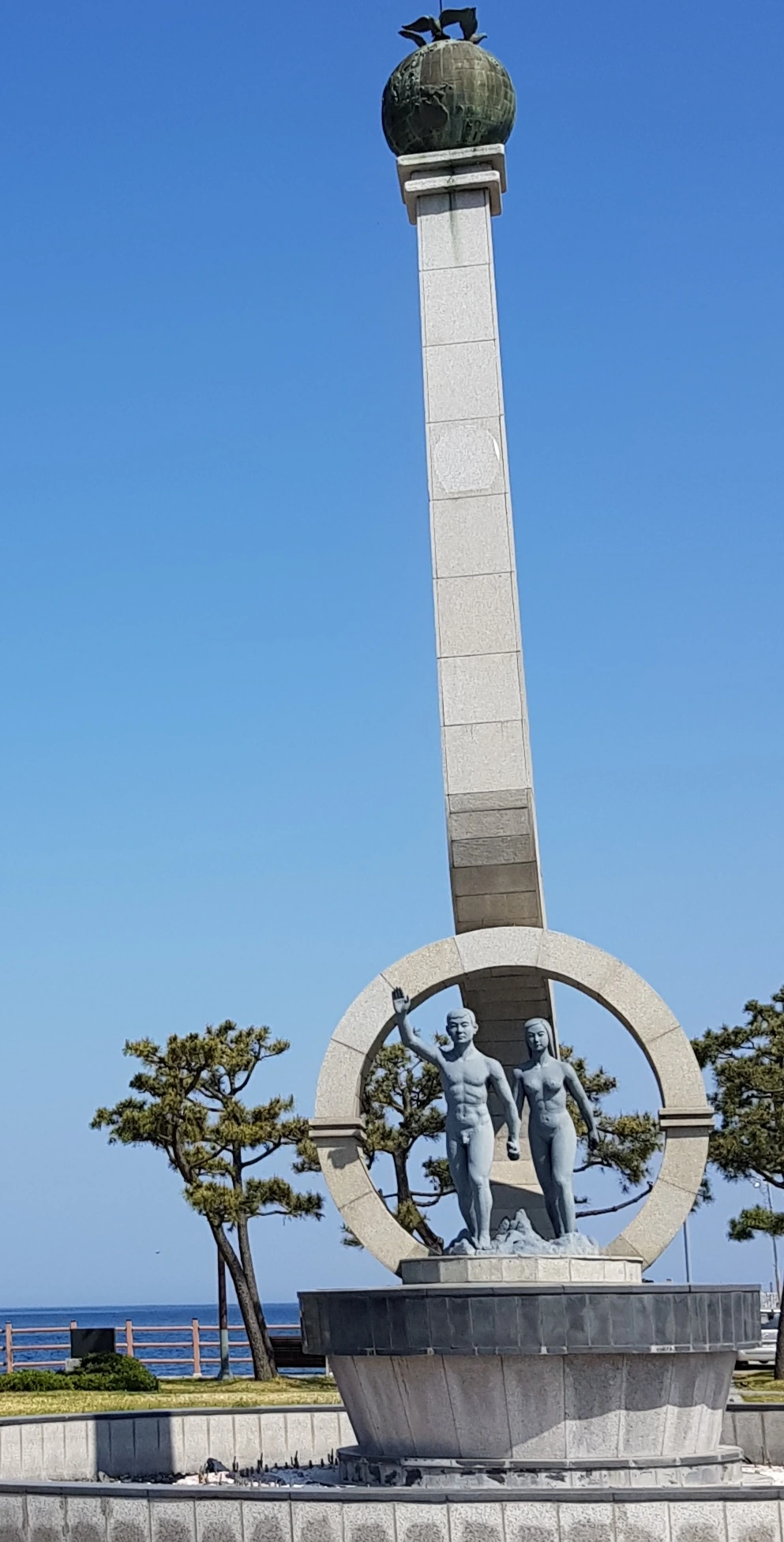 기념탑에는 소년 소녀가 높은 위치에 지구를 받쳐 든