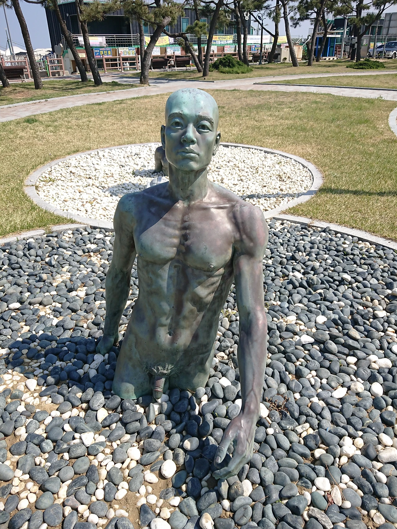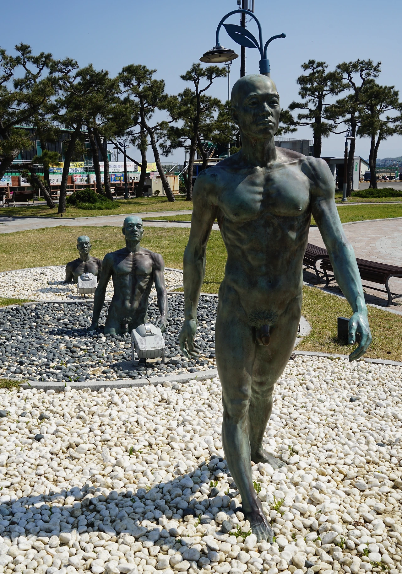 조각공원을 돌아보고 바다를 향해 비치된 벤치에 앉아 공원 안에 굳게 문을 닫은 즐비한 음식점들을 내려다 본다