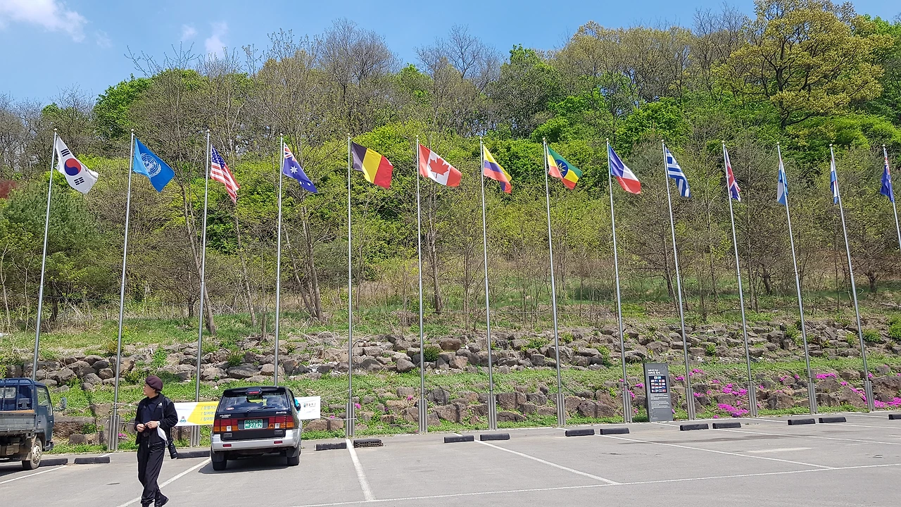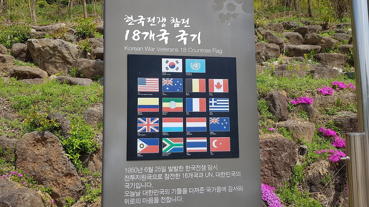 담겨 있었고 주차장에는 전쟁 참전 18개국의 국기가 하늘 높이 바람에 펄럭이고 있었다