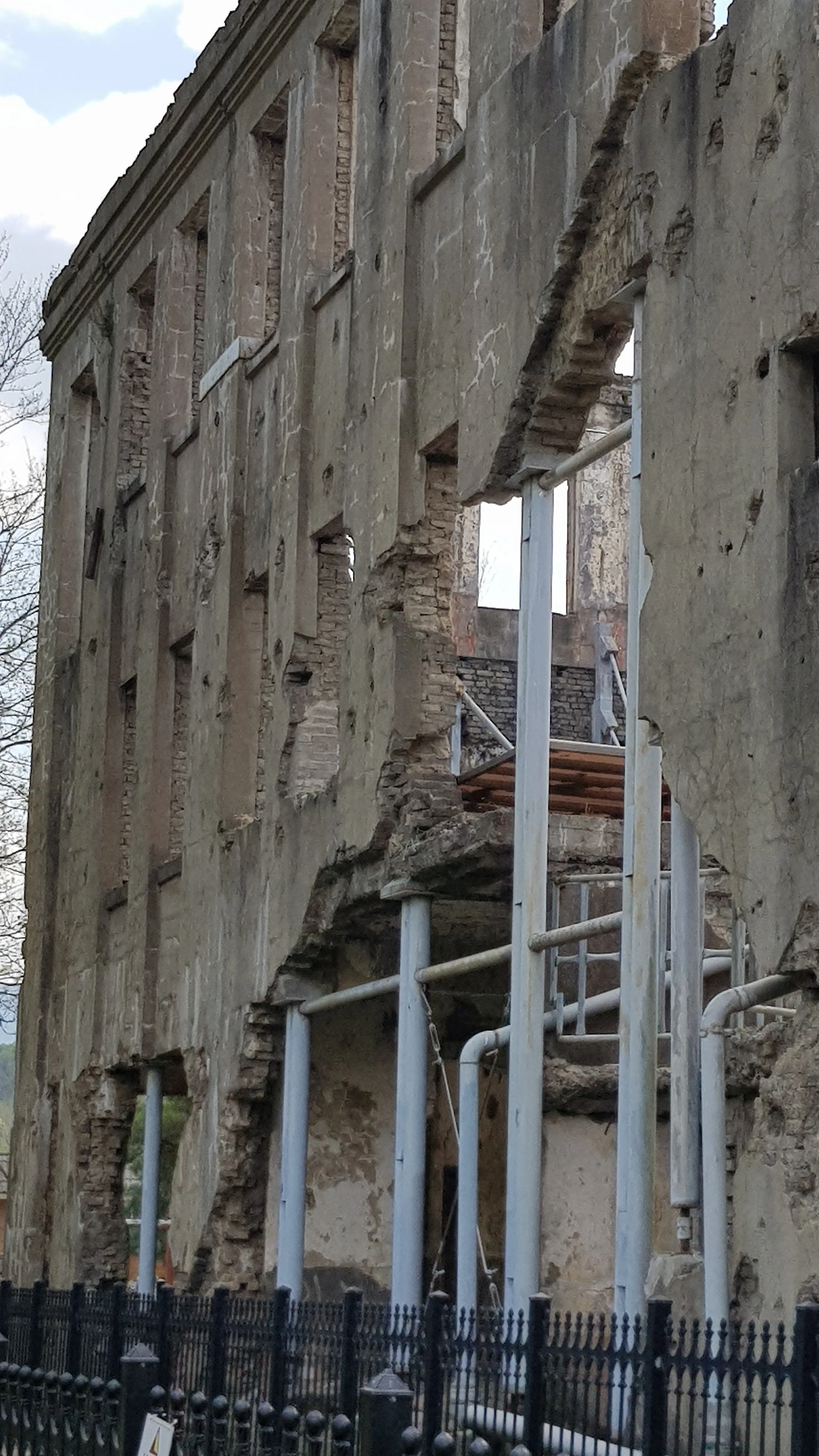 건물의 유지를 위해 쇠 지지대로 받치고 괴우고 외과 수술로 힘겹게 버티며 서 있다