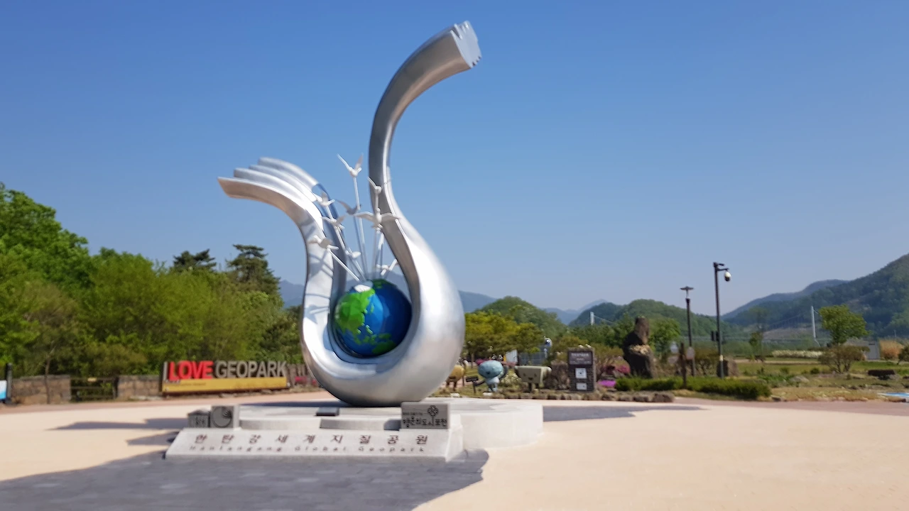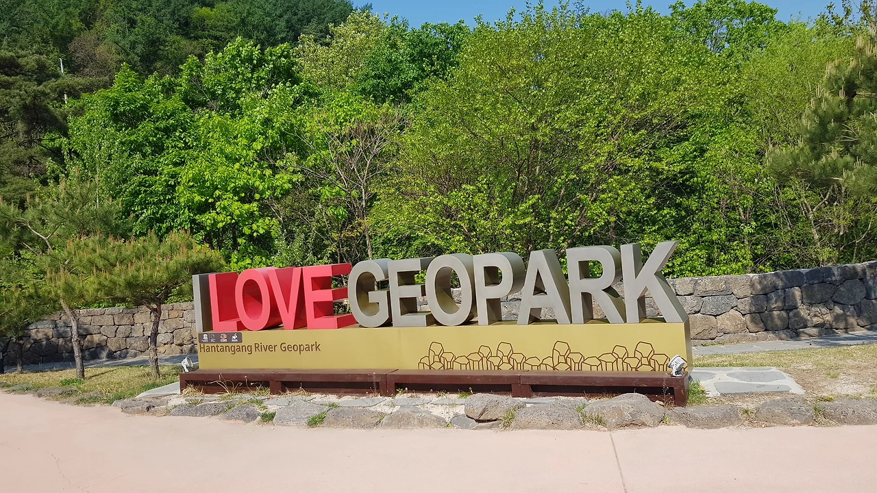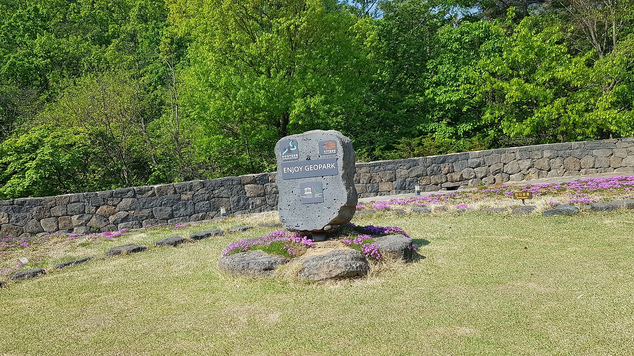 차에서 내리자 유네스코 지정 세계 지질공원을 알리는 거대한 작품이 자랑스레 방문객을 맞이하고 있었다
