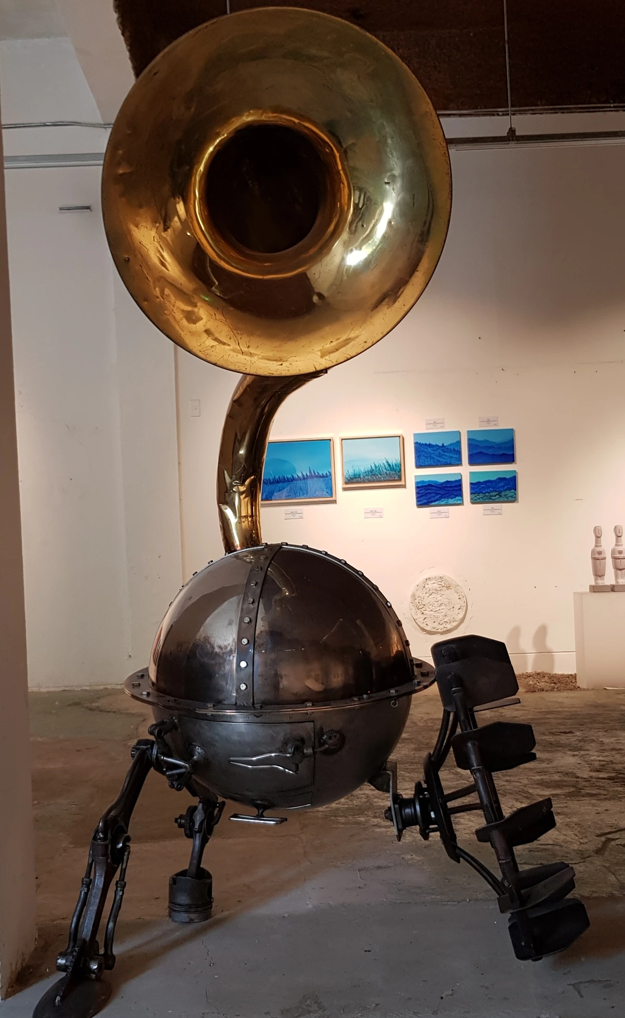 문 앞에 버티고선 정크아트의 말 작품과 나팔이 반기고 피아노도 놓여 있었다