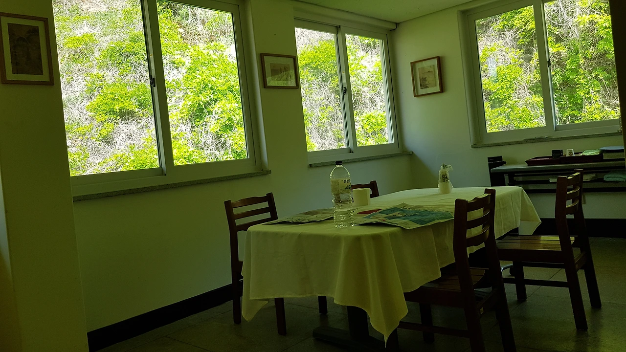 그러나 높은 곳에서 내려다 보이는 뚝 터진 전망은 멋진 산과 동강로 길의 풍경이 아름답고 병방산 정상의 집라인과 스카이워크의 모습도 보여 우리는 그곳으로 향하기로 하고사무실이 있는 건물을 보여 주셨는데 입구에는 겸재 선생님의 작은 그림이 한점 걸려있고 물론 모조품이라지만 그 안에도 그림들이 여러 점 전시되어 있었으며 교육장과 침상, 식사를 준비하는 주방등이 있었다