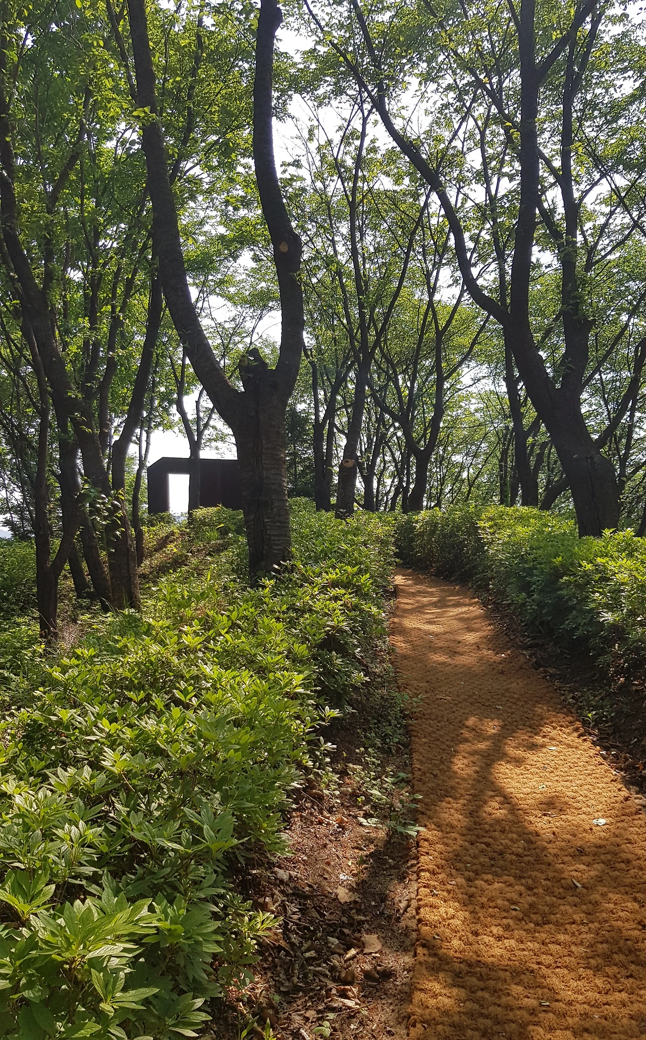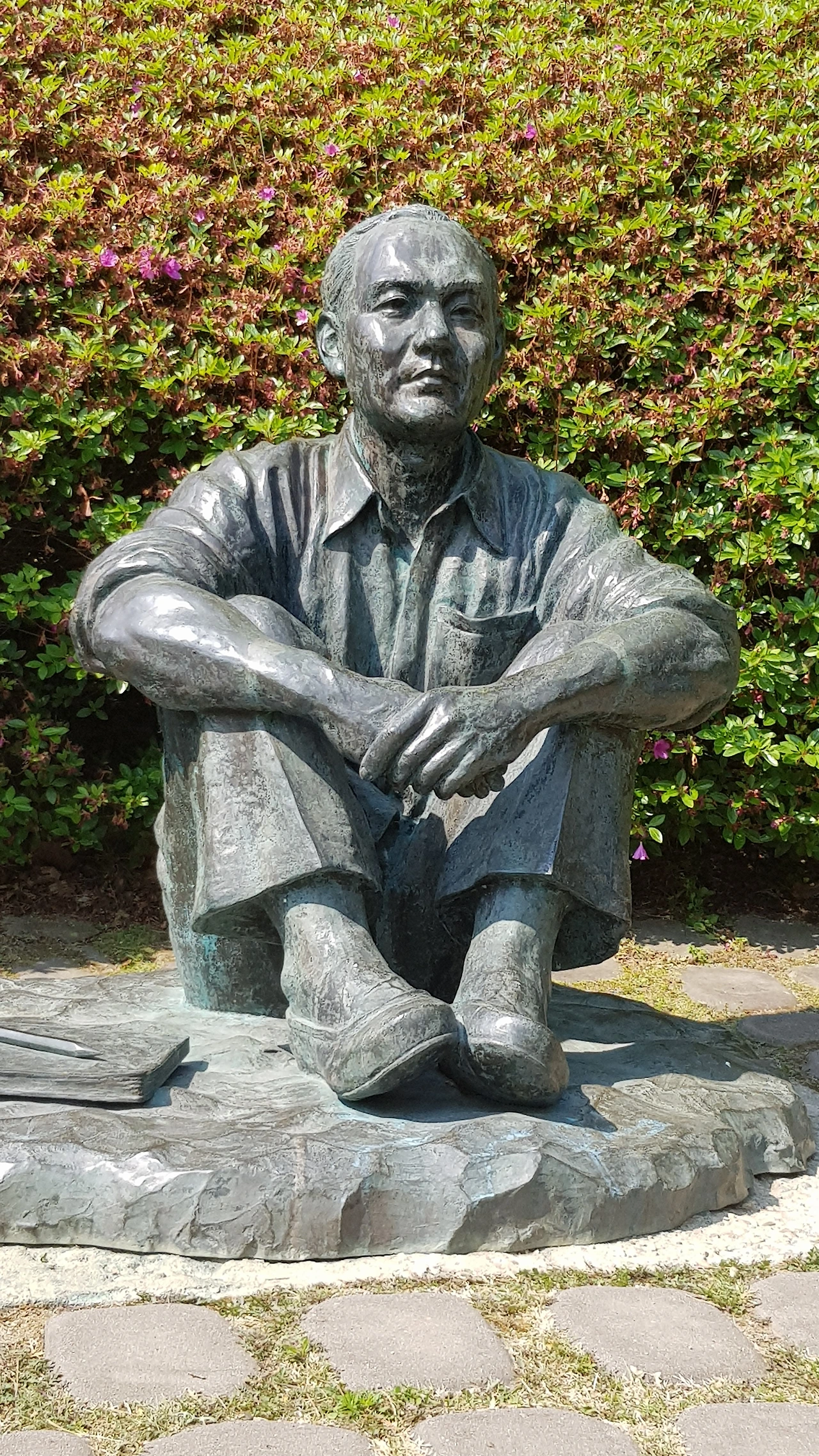 묘지에서 내려와 푯말을 따라 능선처럼 된 곳을 지나니 마당이 나왔는데 작가가 마당가 나무 앞에 앉아 미술관과 작품 등을 바라보며 명상에 잠겨있는 듯한 동상이 있다