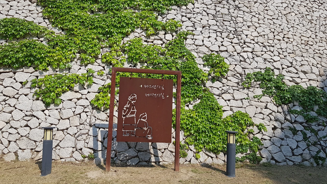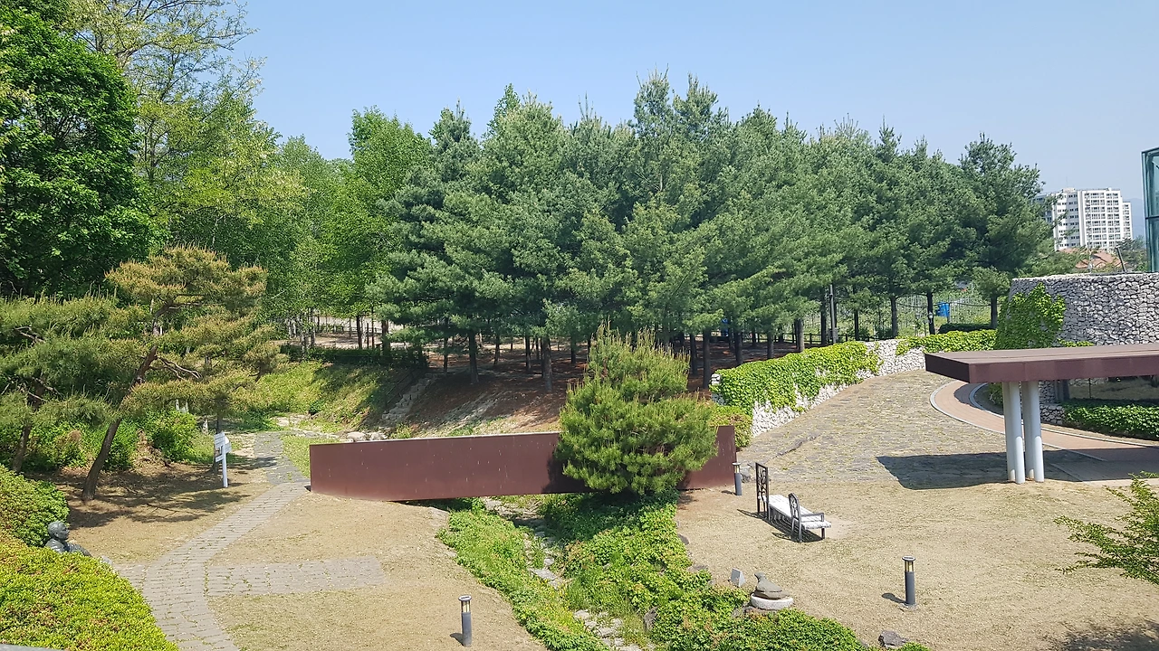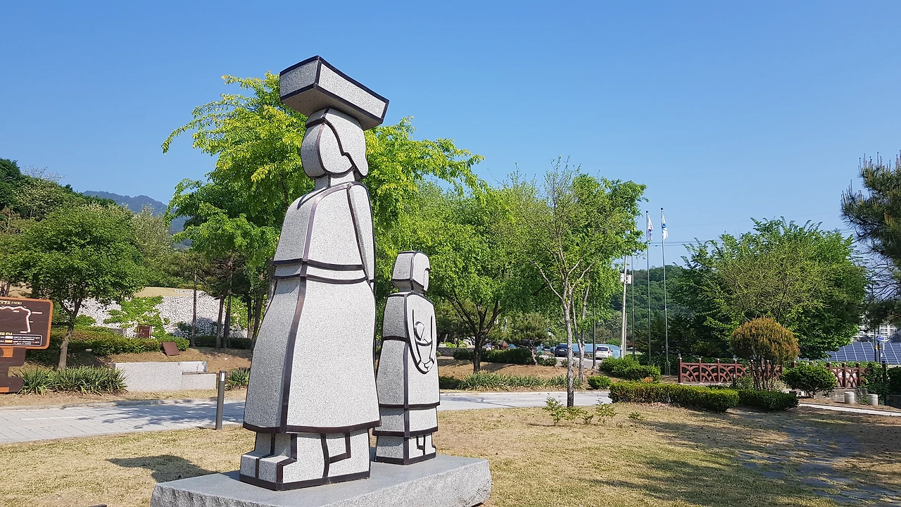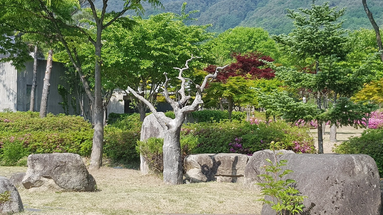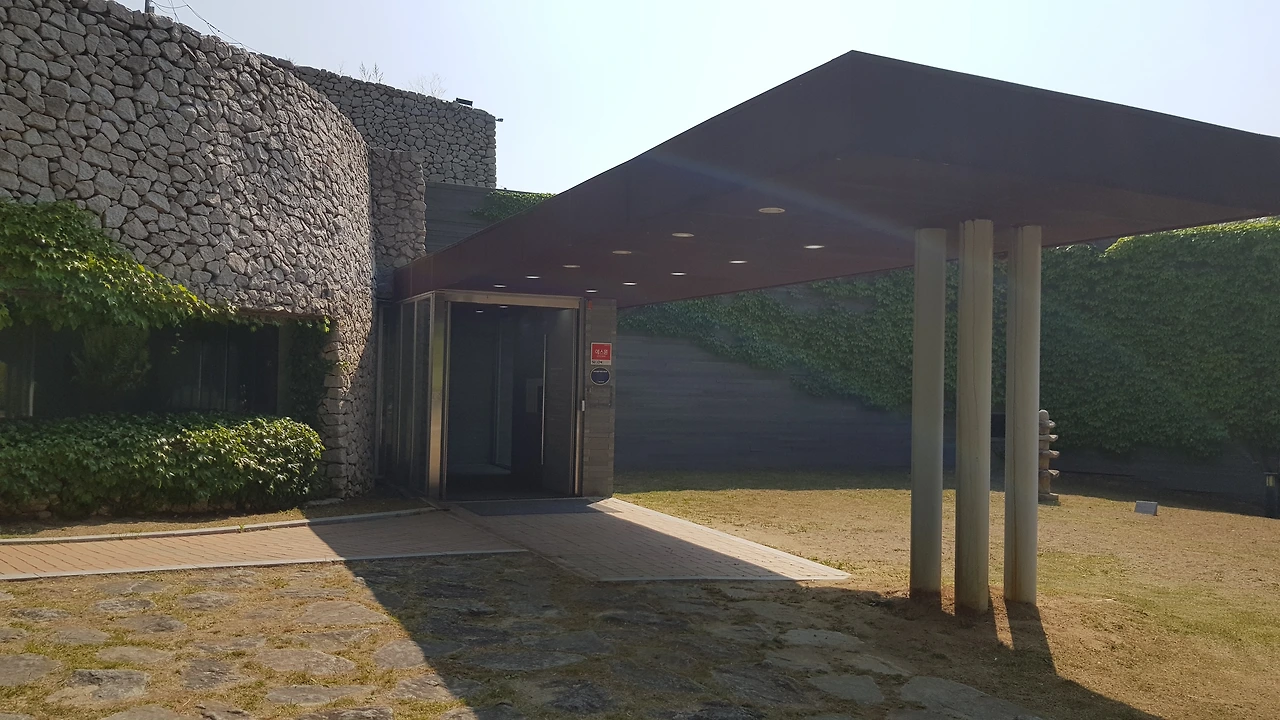 내비 아가씨의 안내로 무사히 미술관에 도착 차에서 내리니 주차장 가까이에 돌담이 둥글게 있고 앞으로는 작가의 작품 속에 있는 작품들이 서 있는 공원이 있다