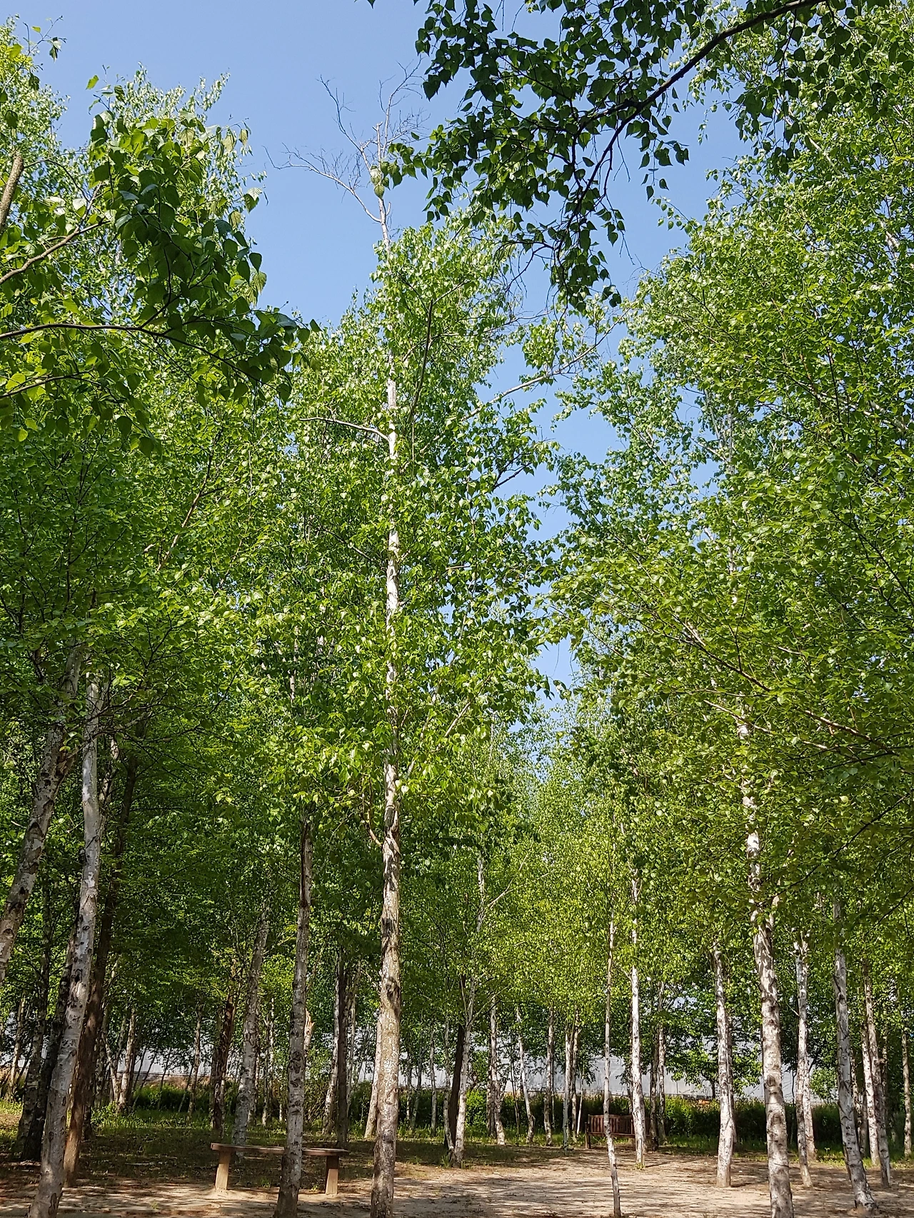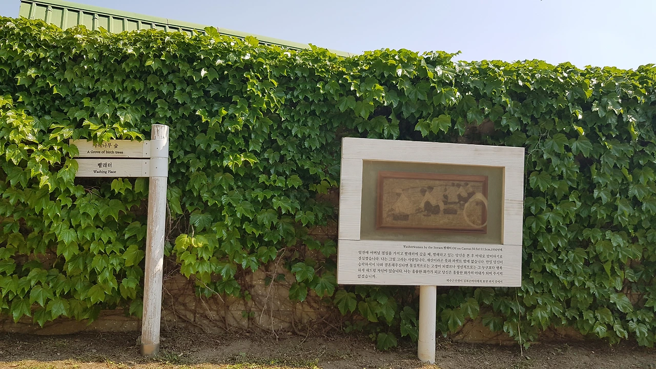 입구에 들어갔으나 10시에 개관이라 해서 10여분 남짓 시간을 보내려 자작나무 숲에서 새소리를 들으며 보내다가 반대쪽 냇가로 나왔는데 그곳에 빨래터 작품이 비치되어 있었다