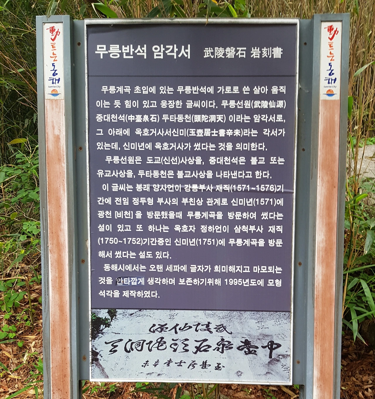 길가에 무릉반석 암각서라는 현판 옆에 커다란 바위에 거침없는 필체의 글이 새겨져 있는데