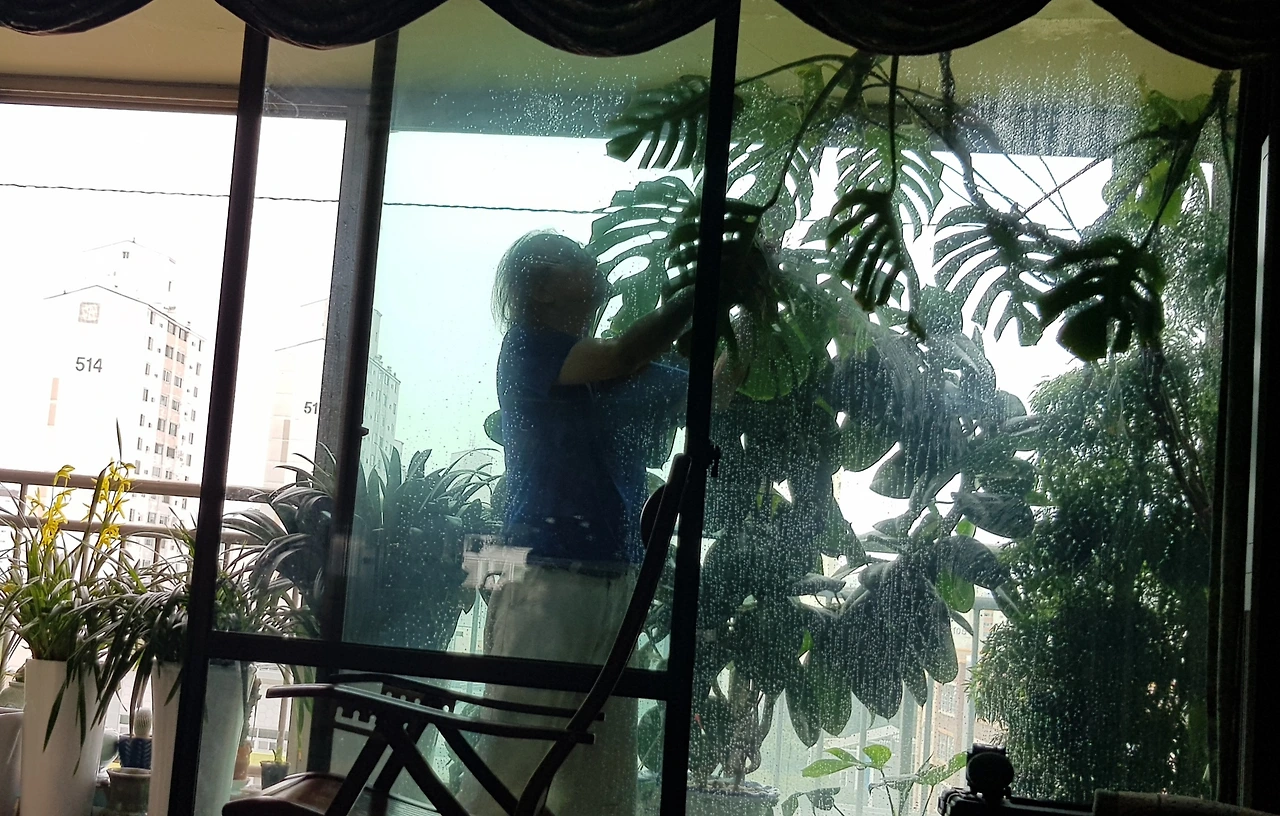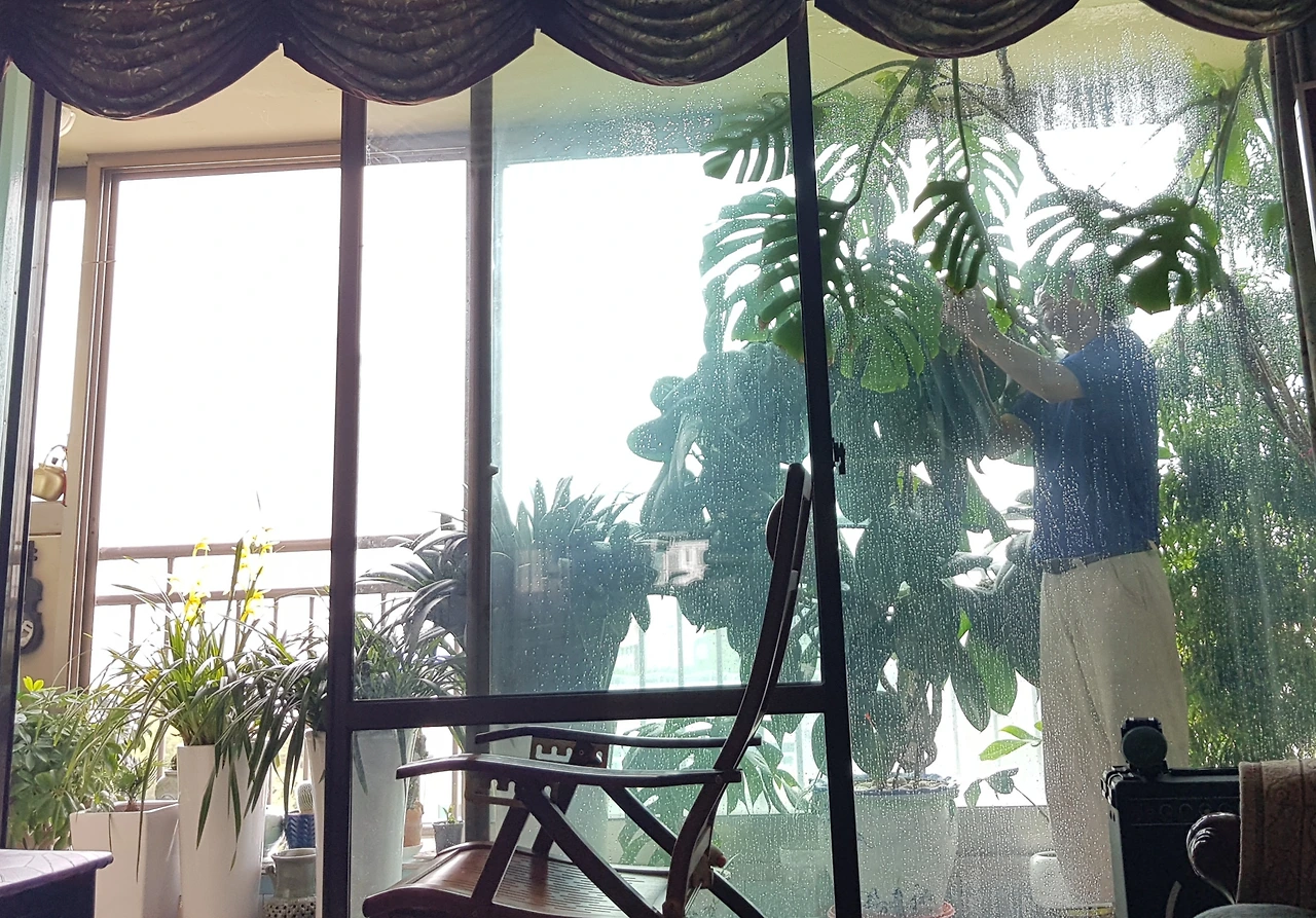 커다란 잎을 한 잎 한 잎 세수시키더니