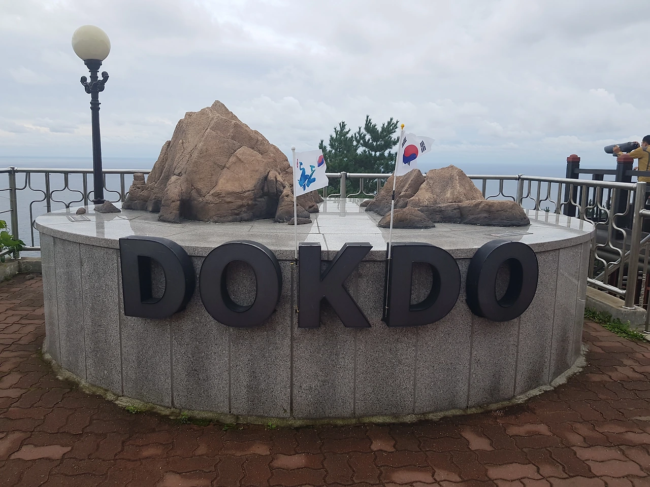 케이블카를 내려서 가계를 통과해 나가니 둥근 원탁에 독도 모형을 만들어 놓고 작은 태극기도 세워두었다