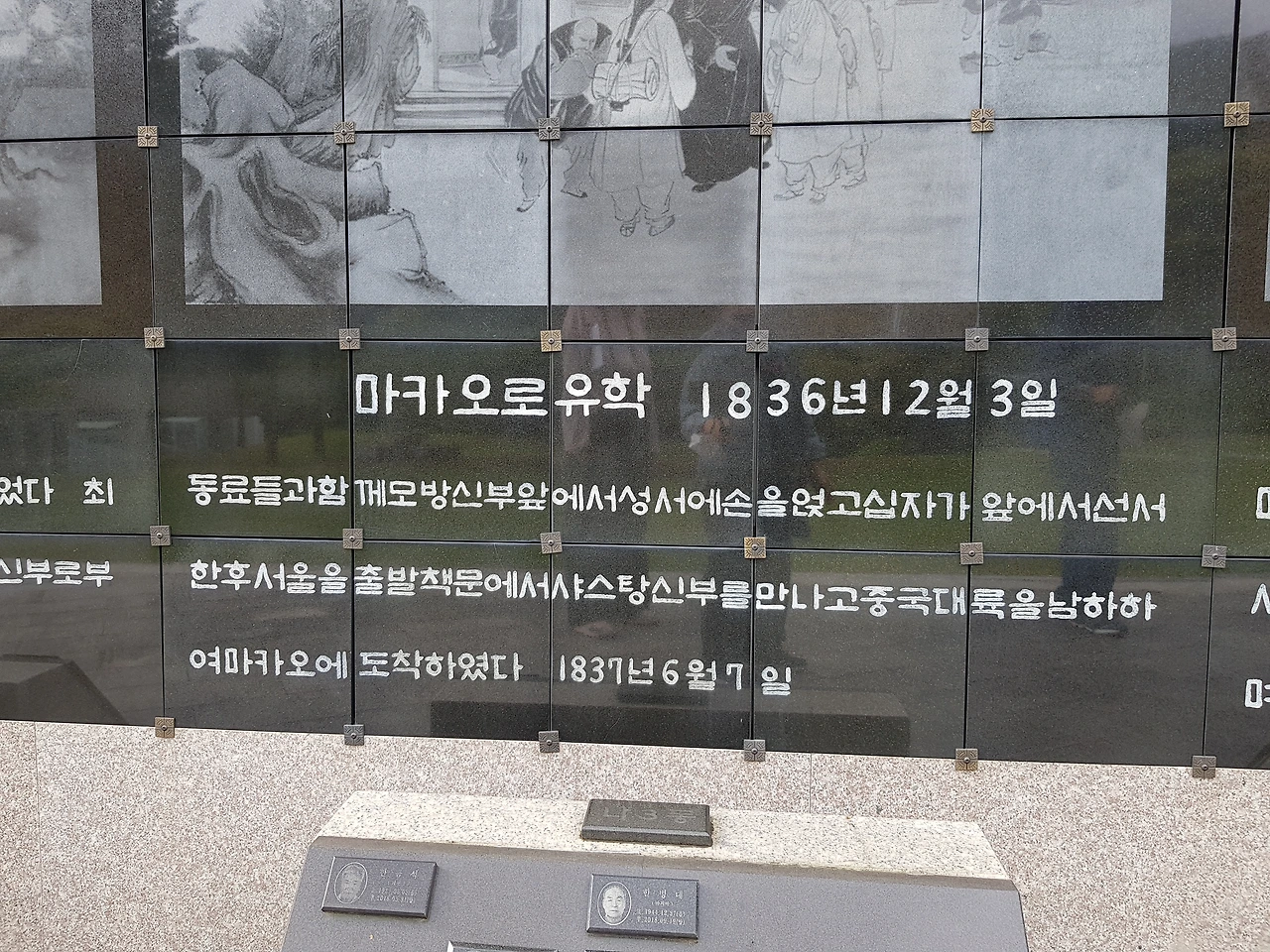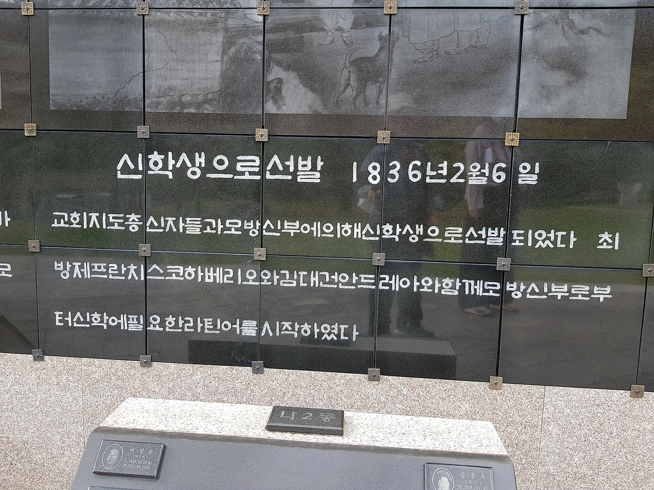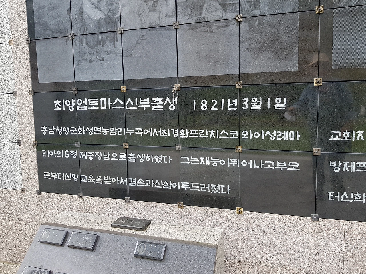 아래쪽에는 최양업 신부님의 일대기가 쭉 칸을 따라 나열되어 있고 위쪽의 정사각 네모로 나뉜 많은 칸에는 칸칸이 유골을 안치하고 있었다