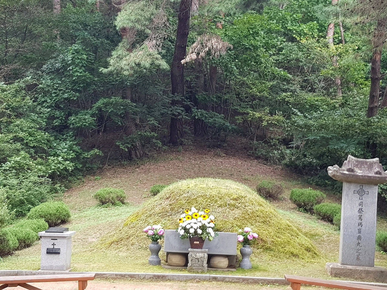 그리 크지 않은 묘역에 자리한 묘지 앞에는 생화와 조화가 꽂혀있었다