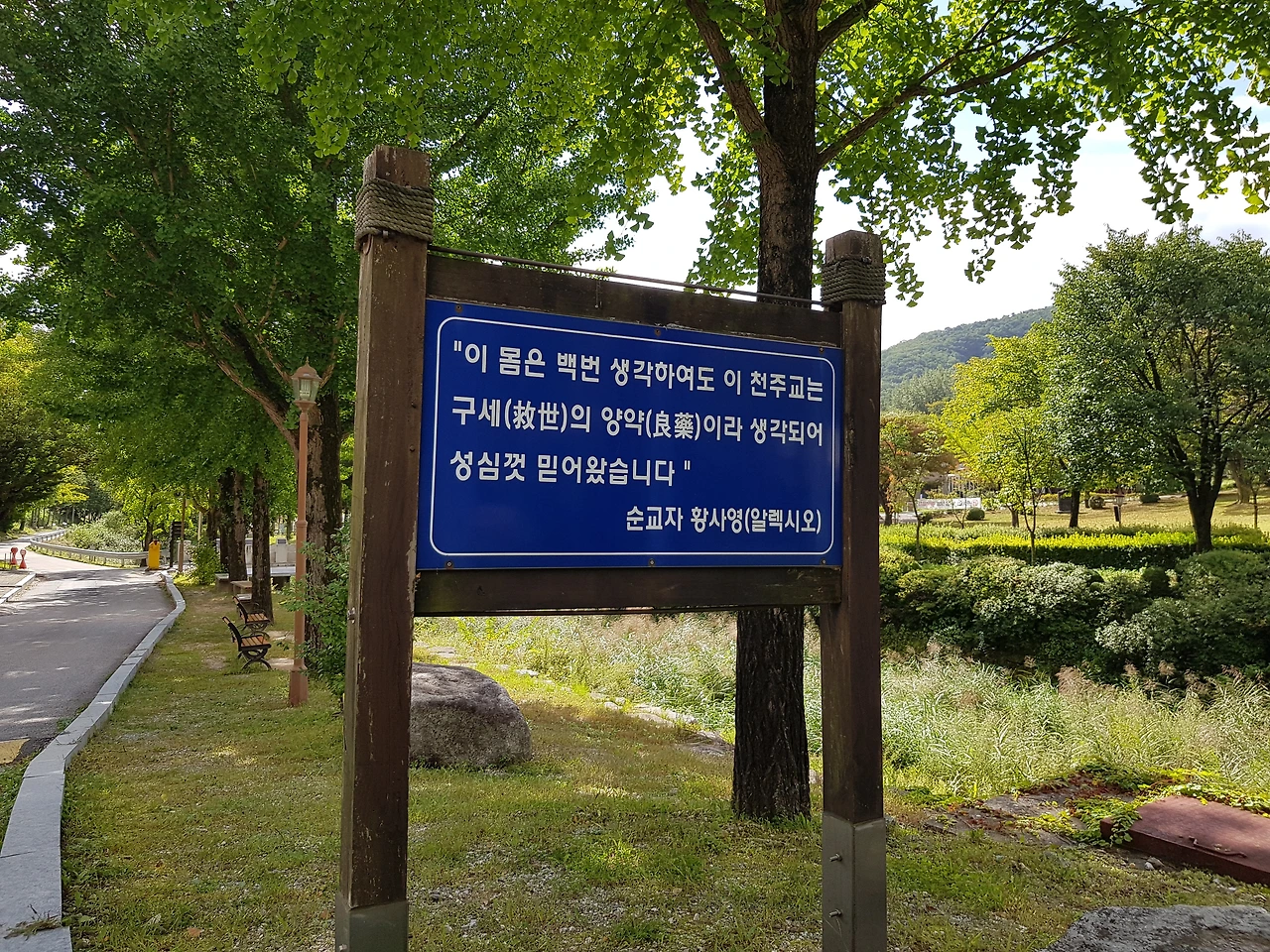 들어올 때와 반대쪽 입구로 나오니 배론의 안내 문이 있고 좀 더 내려와 예전에도 그 자리에 있었던 배론성지의 커다란 입석 이름표를 보며 배론성지를 떠나왔다