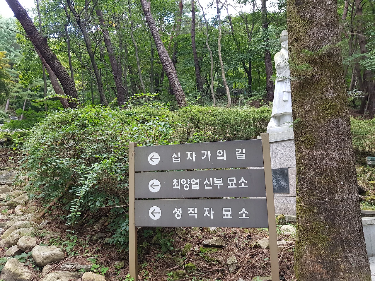 그곳을 돌아 나와 만나는 조각을 향해 부지런히 셔터를 누르다 보니 잘못 디디면 끊어질 것 같은 흔들리는 나무다리를 건넜다 조심조심 셔터를 누르며 걷다 보니 드디어 세 번째 만나는 보물 최 양업 토마스 신부의 묘역 안내판이 있었다