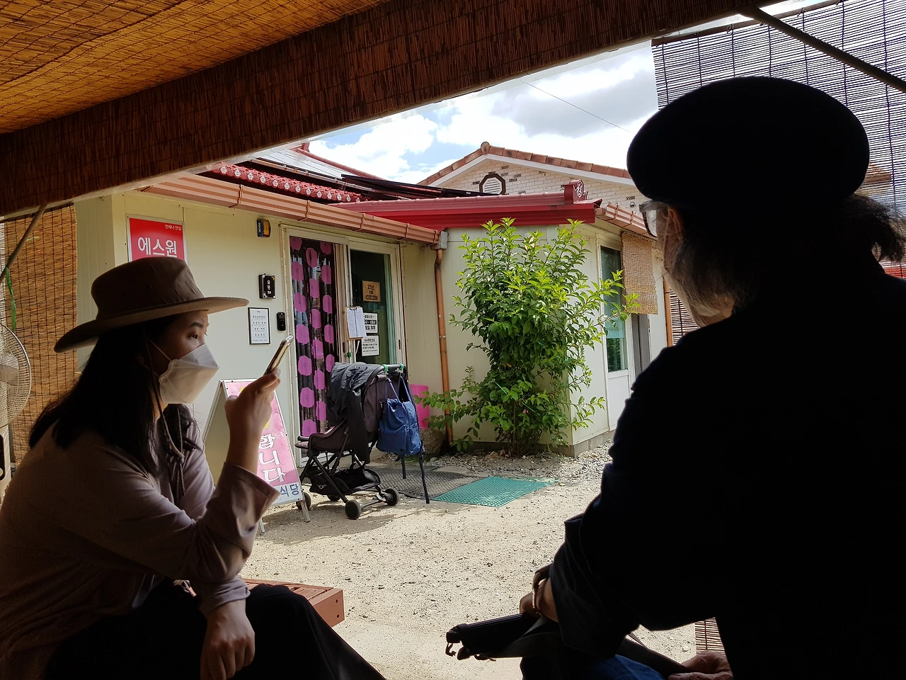후식으로 딸이 식당에서 가지고 나온 시원한 식혜를 기다림 터에 앉아 마시며 잘 먹은 점심으로 모두의 얼굴에 웃음꽃 활짝 ㅡ