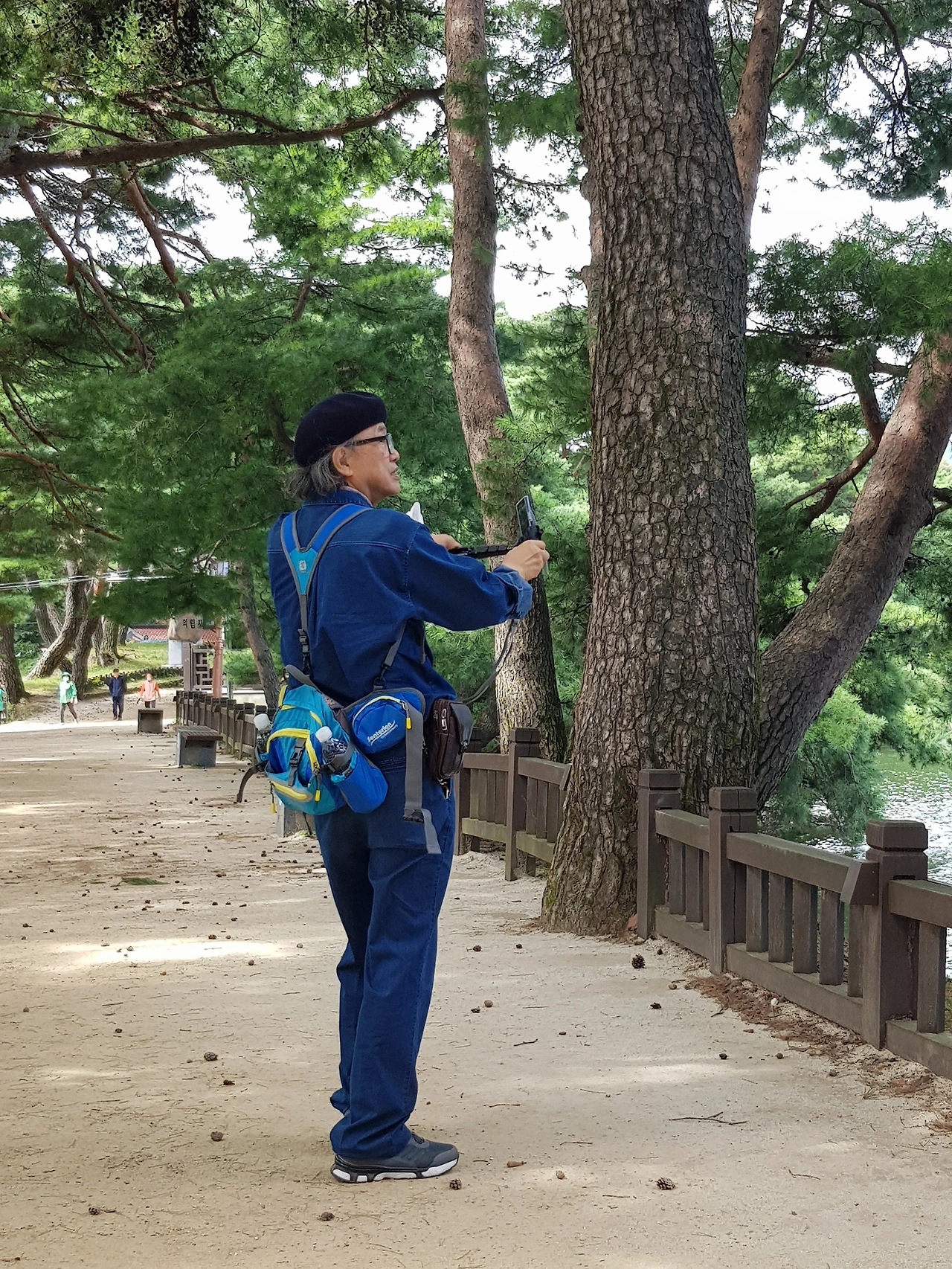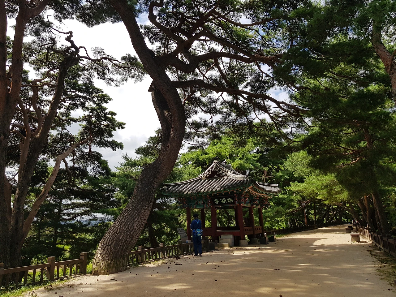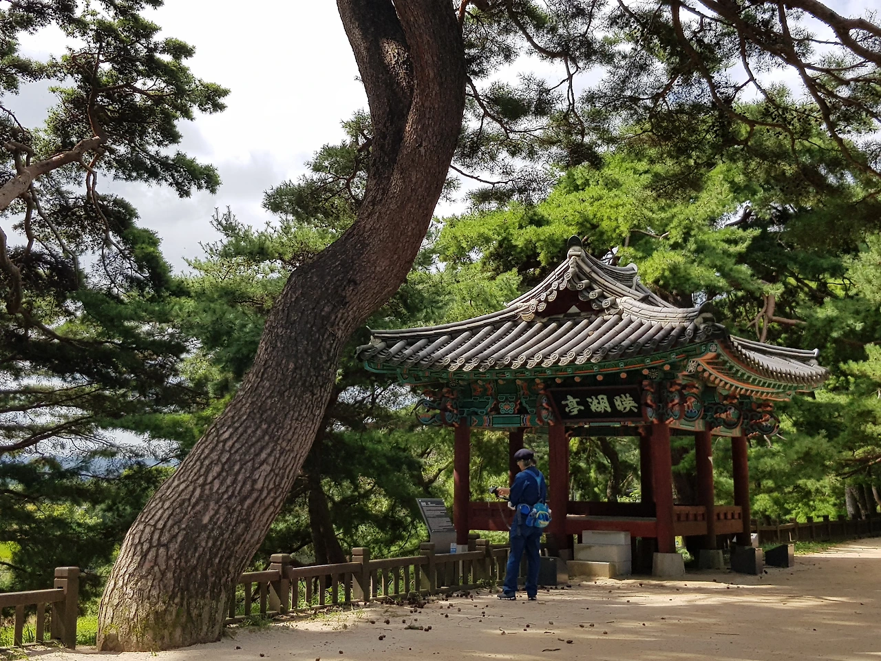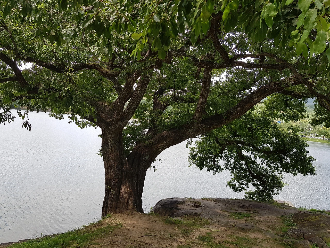오리배를 타는 쉼터 쪽으로 가보니 여러 방송국에서 촬영한 포스터가 붙어 있었고 비치된 벤치 쪽으로도 엄청난 크기의 소나무들이 있었는데 한 그루는 두 그루가 하나인 연리지인지 아님 한그루가 나와 갈라졌는지 ㅡ하지만 나는 사랑의 연리지로 보기로 하고 한컷을 담아 보았다