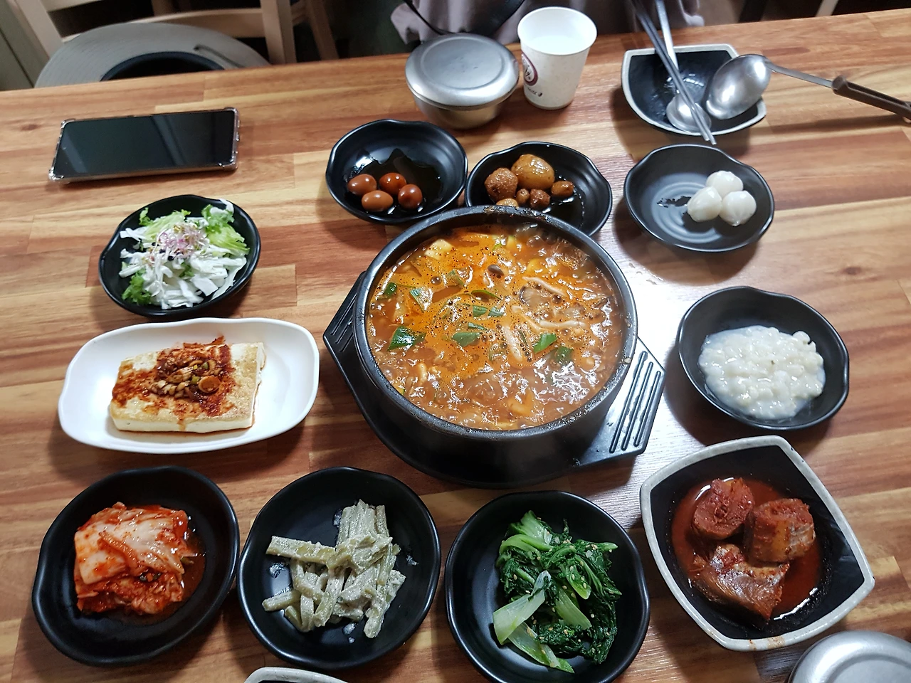 우리도 한쪽 방으로 안내되었는데 네 팀이 앉을 수 있는 크기로 한 탁자에 자리하고 청국장 3인분을 신청하고 10여분을 좀 더 기다리니 정갈해 보이는 찬들이 세팅이 되고 좀 더 기다리자 밥과 청국장이 나왔다
