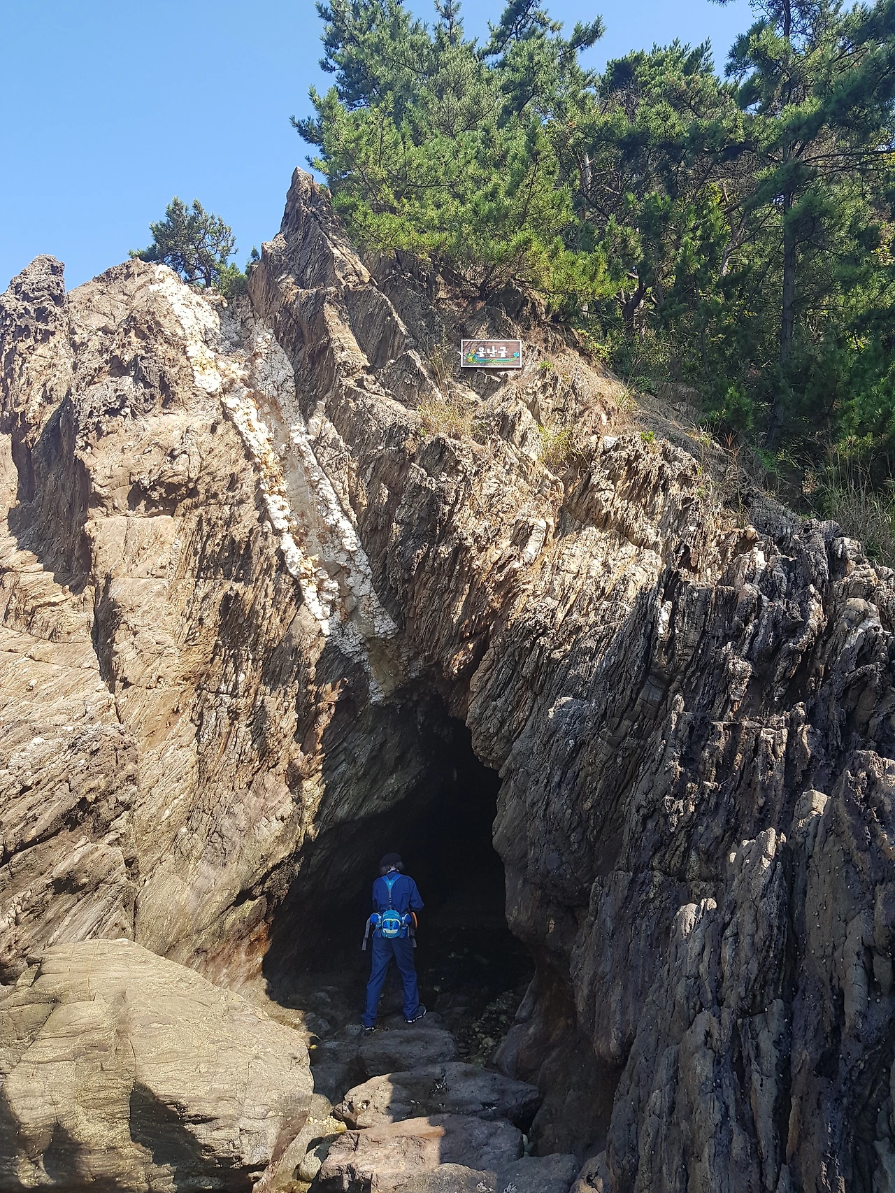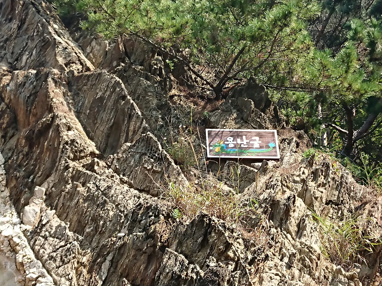 돌이 날카로워 조심조심 바닷길100여 m를 들어가자 바닷물이 다을듯한 곳 바위 위쪽에 용난굴의 이름표가 붙어 있었고 굴 입구가 입을 벌리고 기다리고 있었다