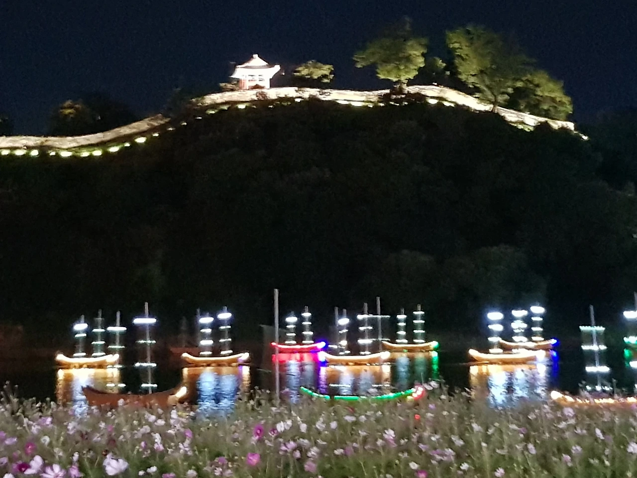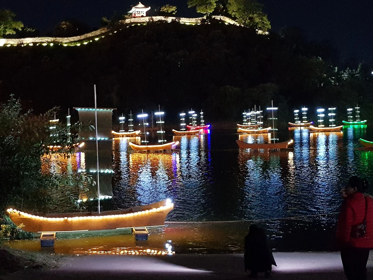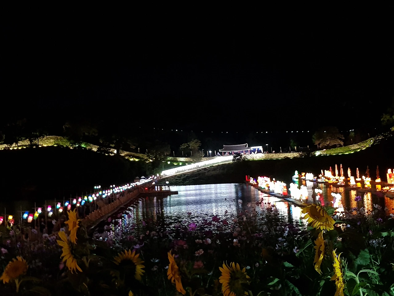 공산성을 잇는 불빛과 강가의 알록달록한 불빛의 배들, 배다리 청사초롱의 불빛과 주변의 이야기 인형들 까지도 모두 알록달록 빛을 품어내고 있었다