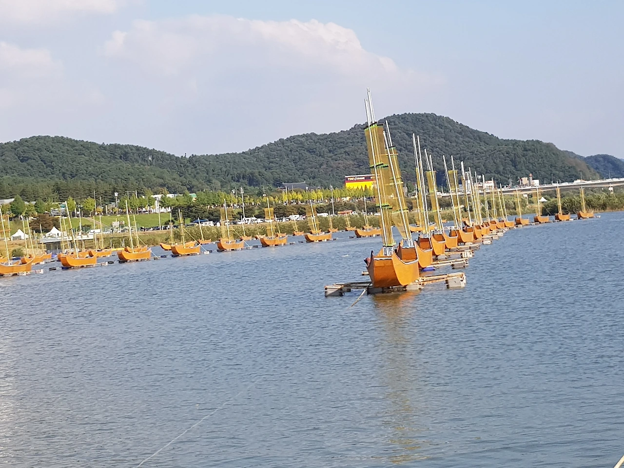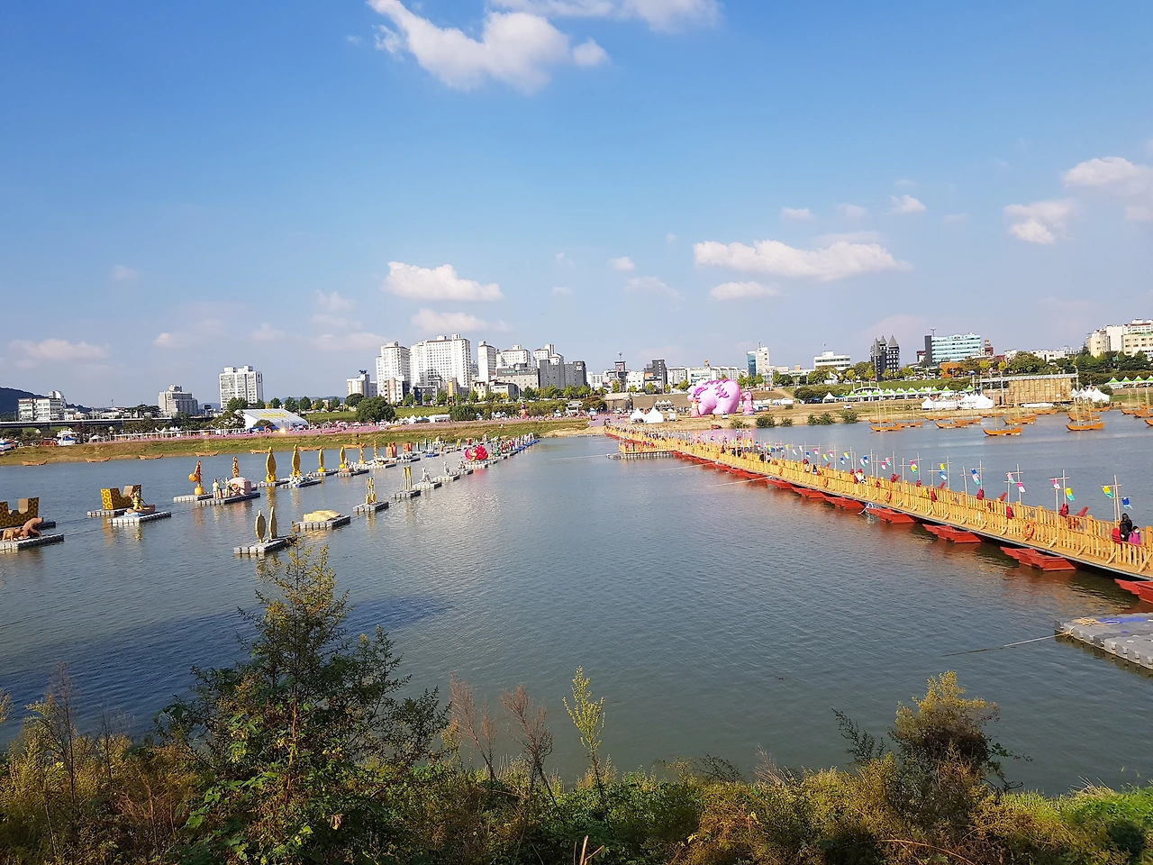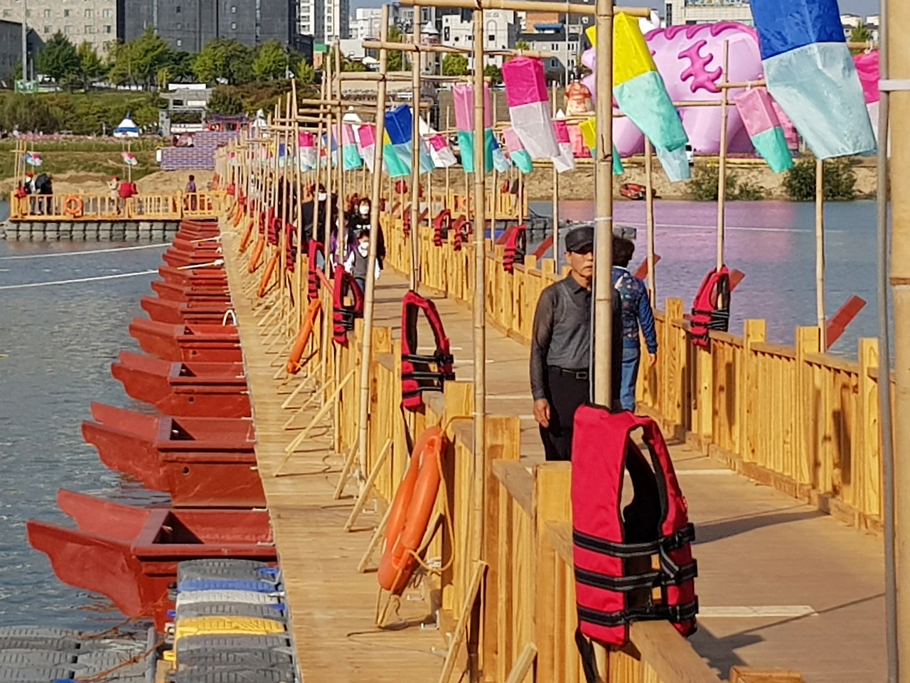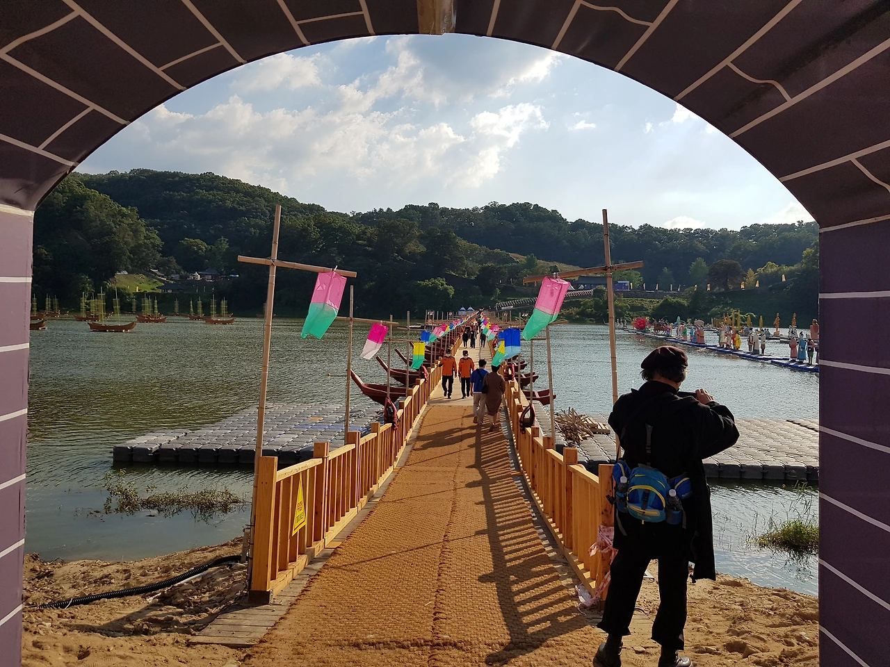 다양한 이야기들을 돌아보고 강가 배다리가 있는 곳으로 와보니 강을 가로지르는 배다리가 공산성으로 이어지고 있었으며 수많은 작은 배가 줄지어 강을 메우고 있었다