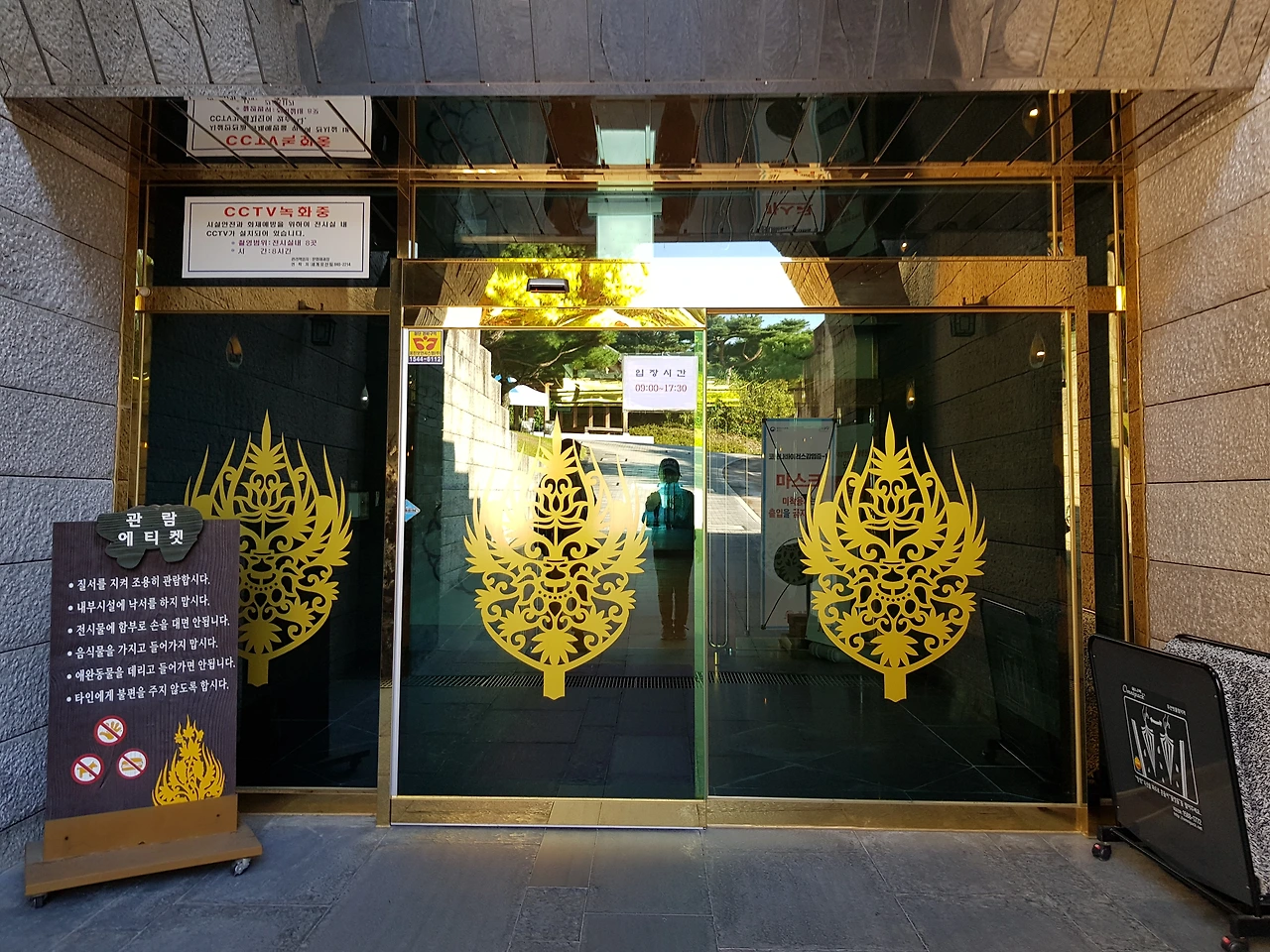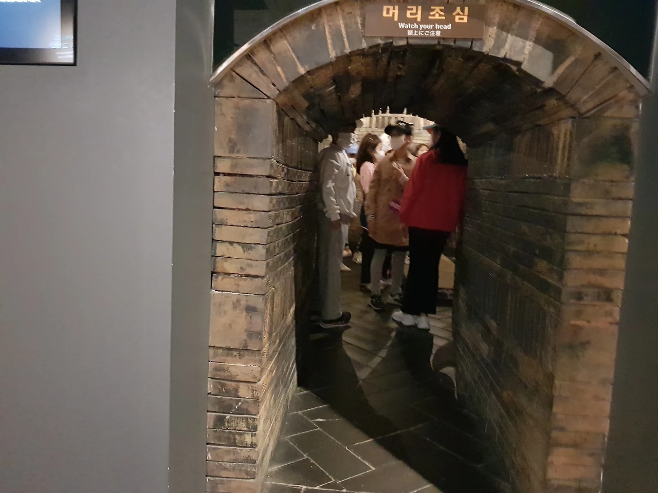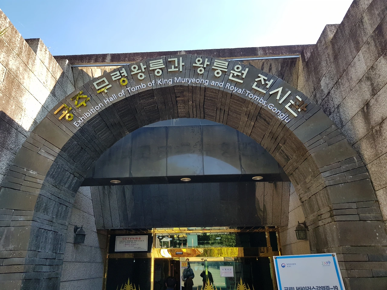 금관의 화려한 귀 장식으로 찾는이를 맞는 문을 밀고 입장을 하여 무령왕릉 출토시 나온 여러 유물(모형)을 살펴보고 왕릉의 내부와 같은 크기로 설치되었다는 무덤 내부로 들어가 보았는데 입구는 낮고 좁아 웅크리고 앉은 자세로 들어가야 했다