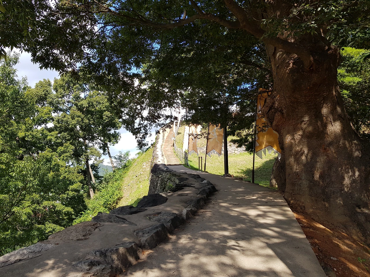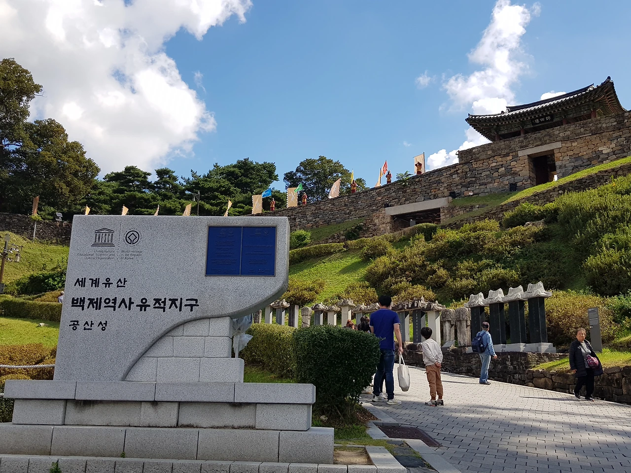 길가에서 올려다본 공산성은 그리크지 않은 아담한 모습에 석조의 벽은 튼튼해 보였으며 성벽을 타고 흐르는 능선은 그 흐름이 부드럽고 아름다워 보였다