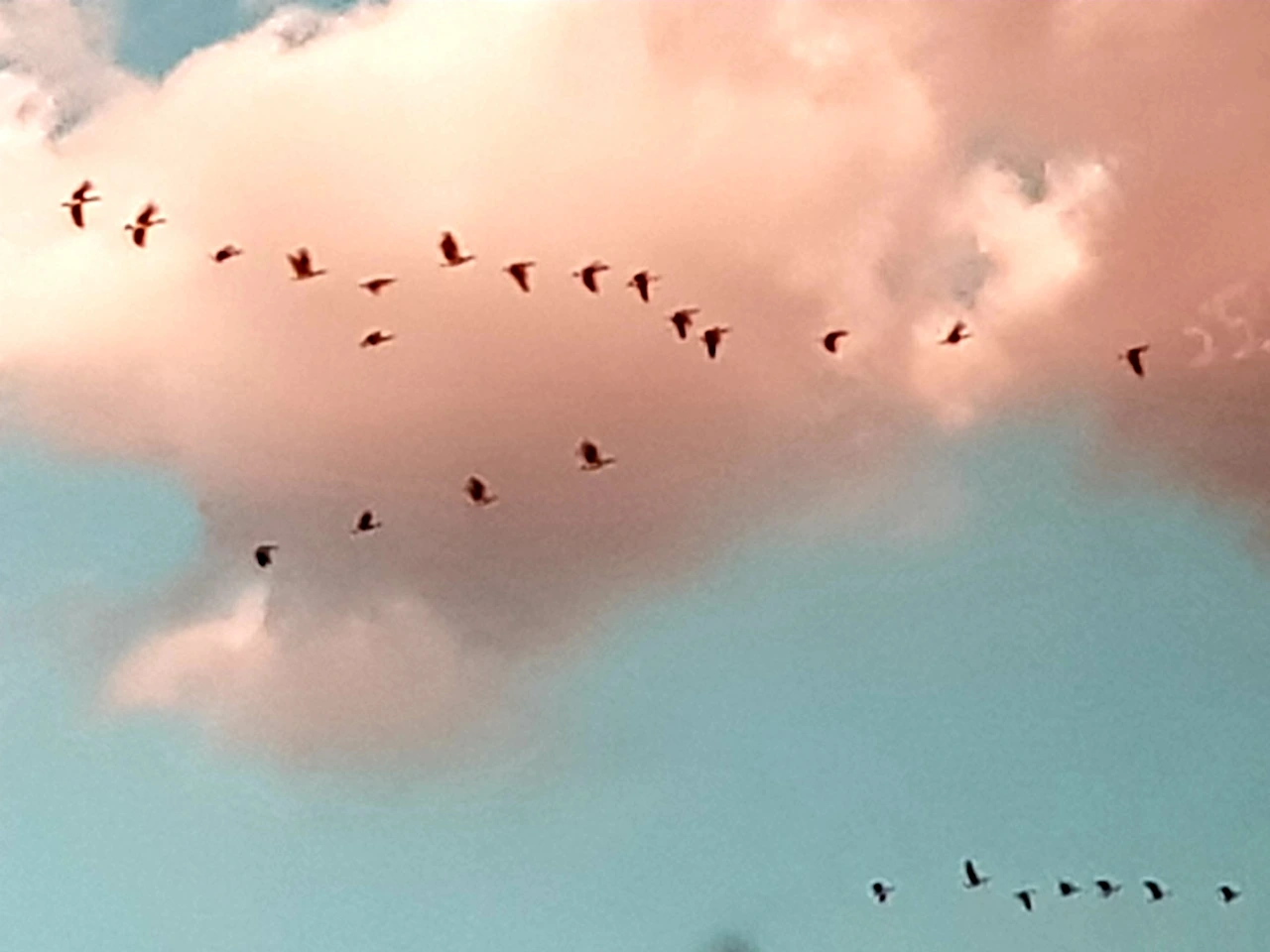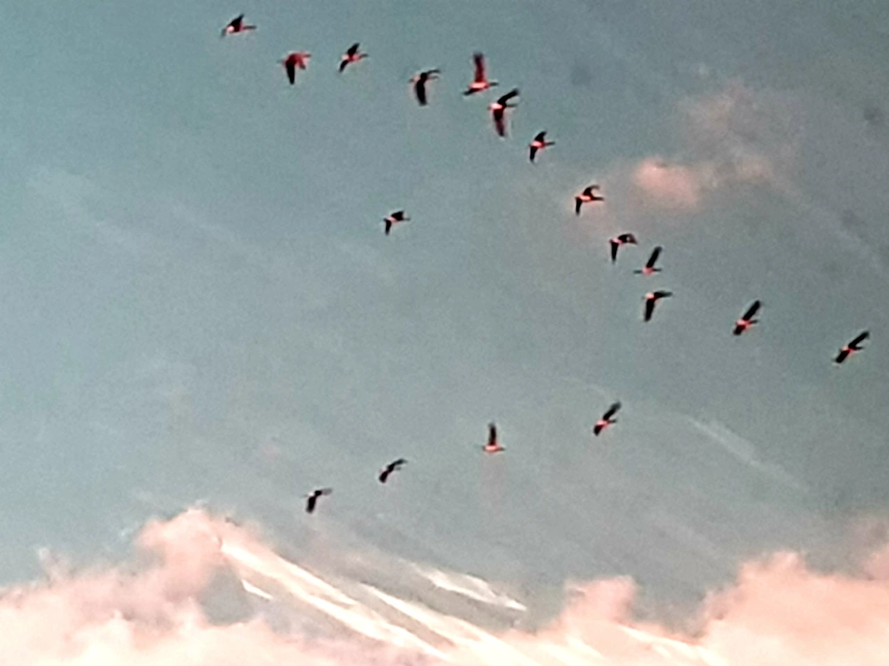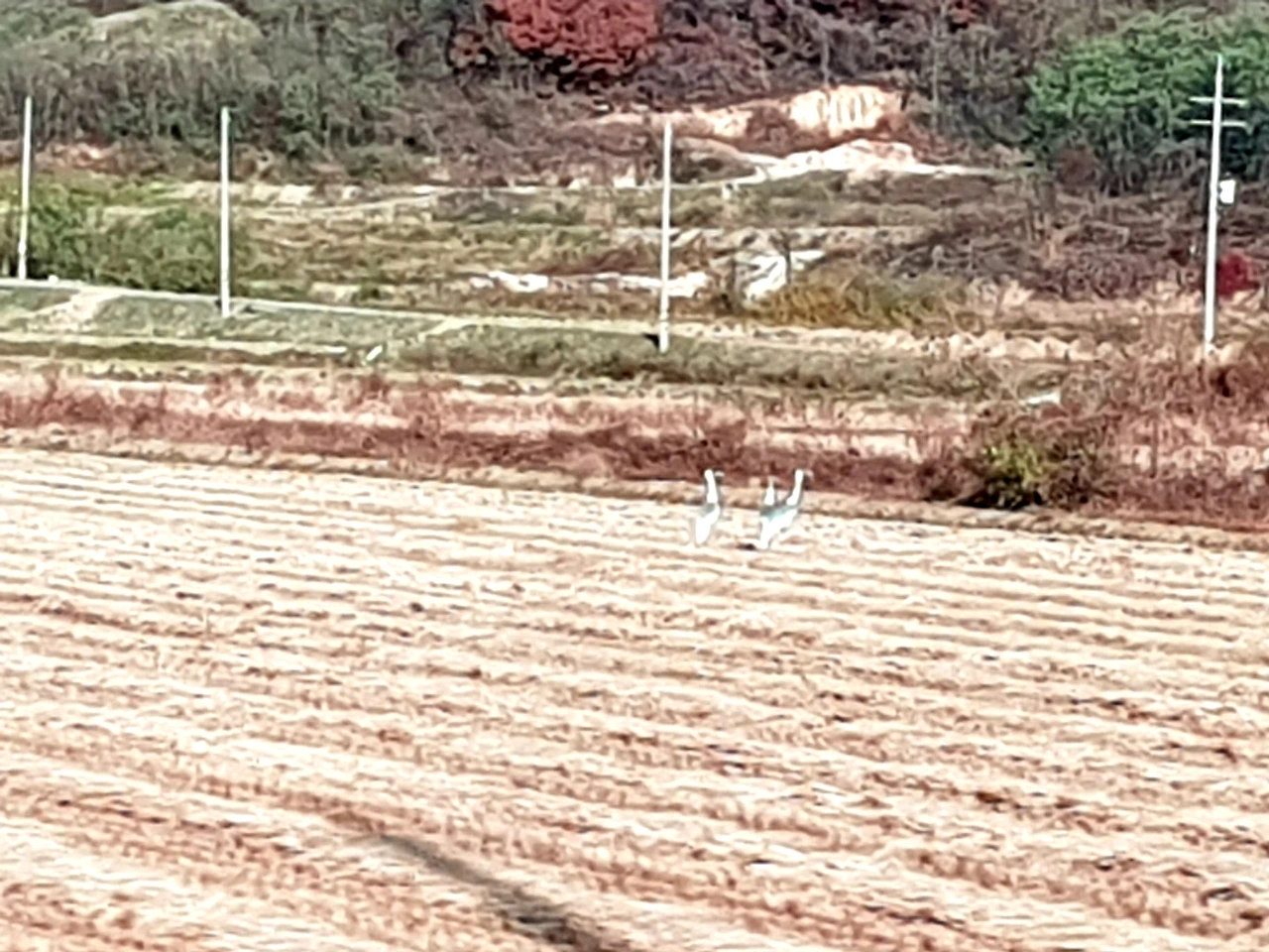 그럼 들판에도 두루미들이 있을 터인데 들어오는 길에 무심했으니 다시 나갈 때 자세히 보아야겠구나 라며 주차장으로 돌아오는데 깜짝 선물이라도 주는 듯 두루미 떼가 하늘 가득 날고 있는 게 아닌가