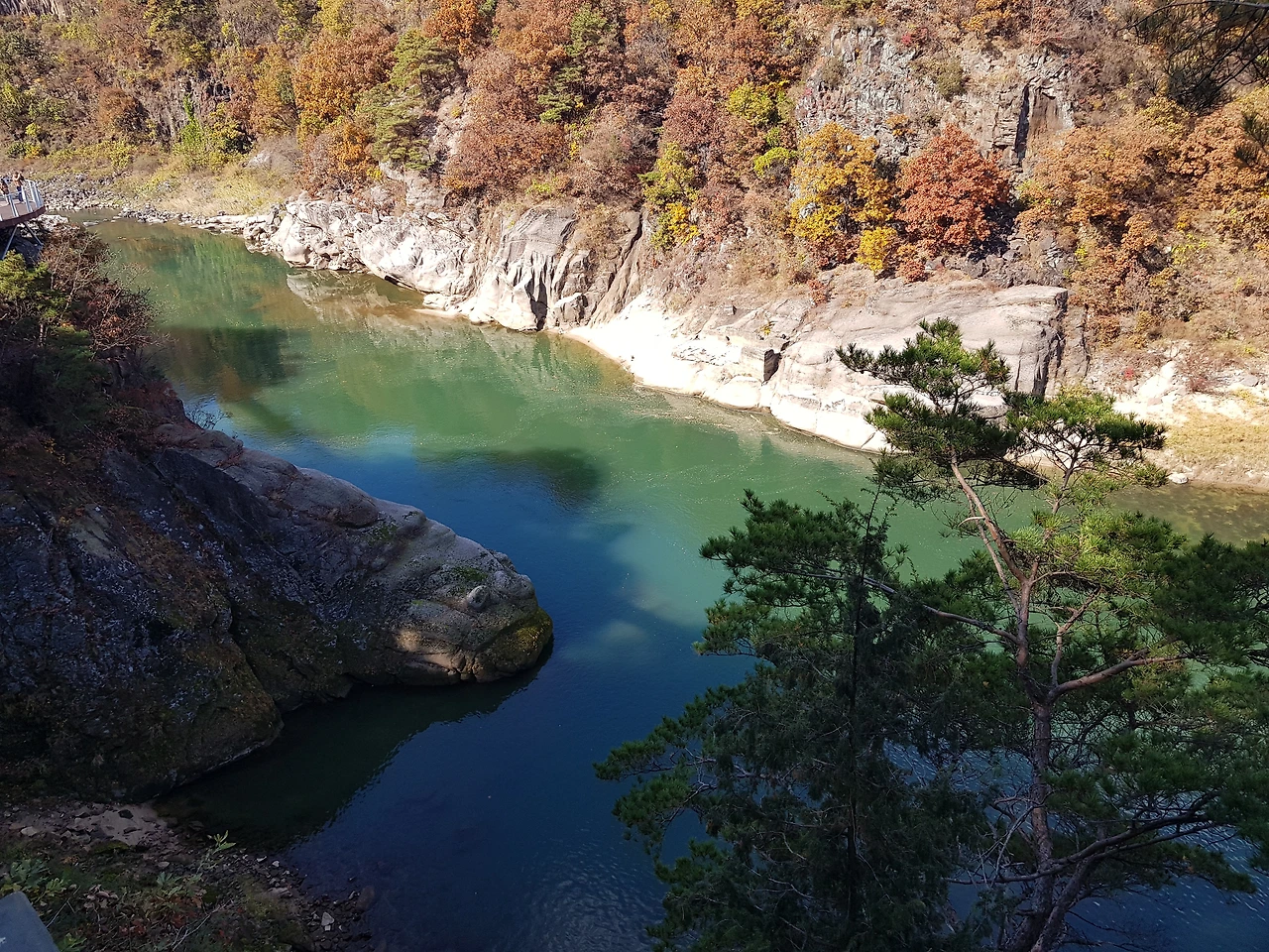 산허리를 돌며 이어지는 물 윗길 절경을 바라보며 계단을 오르고 내리기를 반복하며 3.6km의 길을 약 1시간 30분쯤 걸었지만 한탄강을 감싸고 함께 춤추듯 그림 그리듯 이어진 주상절리는 물윗길을 찾는 여행자들의 이어지는 발길로 보아 그 오묘함으로 사랑받고 있었다
