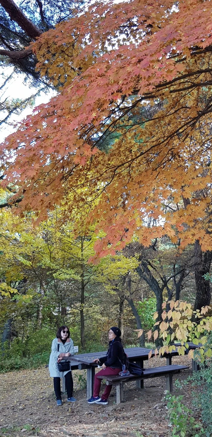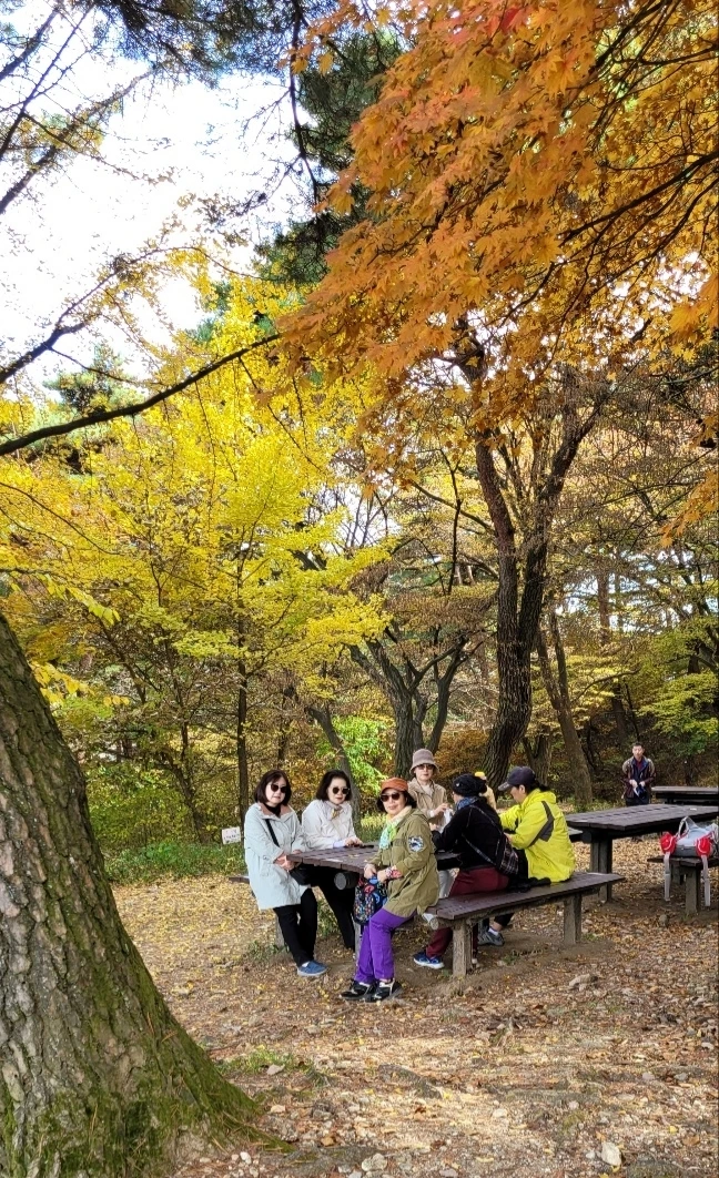 수어장대를 돌아보고 내려오는 숲 속 벤치와 탁자가 가을을 즐겨보라 부르기에 그곳에 앉아 각자의 가방에서 나오는 간식을 즐겼는데 특히 총무님이 구워온 군고구마가 단연 압권이었다