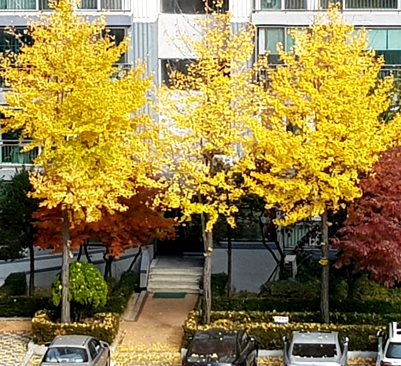 앞동 출구 쪽 은행나무가 바람 타고 하늘하늘 노란 비를 내리며 나무 위에도 차들의 등에도 입구에도 샛노랗게 색칠해 놓고는