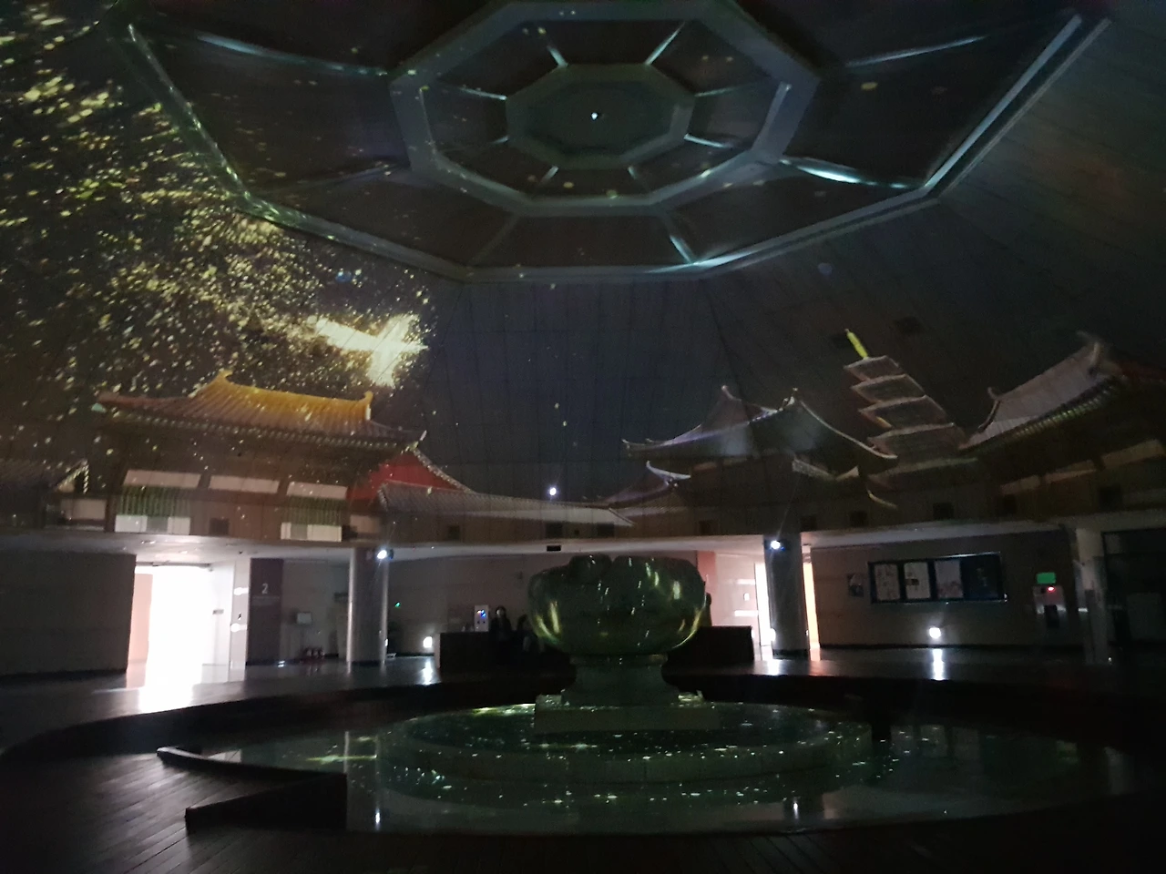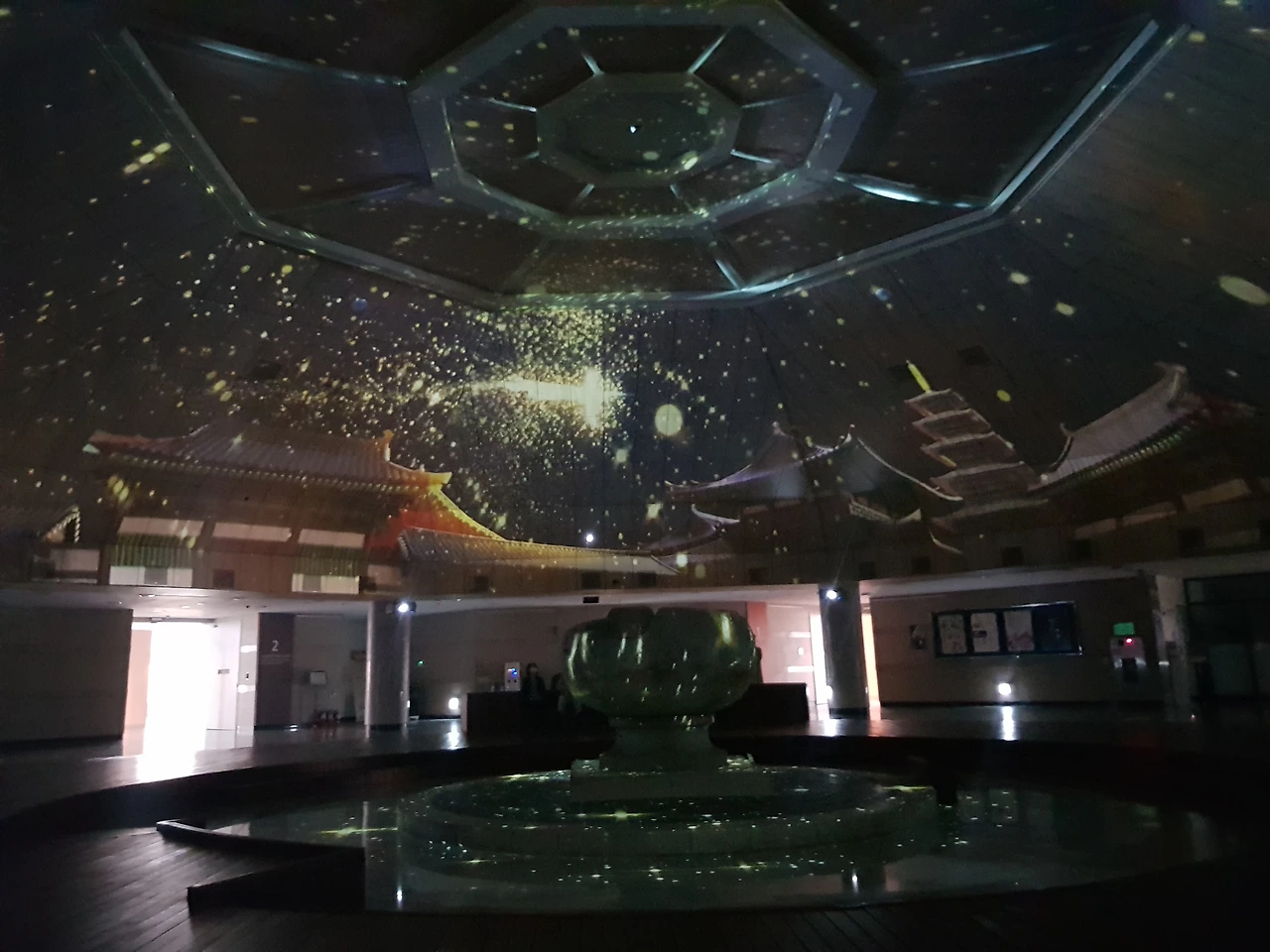 사람들이 모여들어 둘레를 채우고 아름답고 웅장한 효과음과 함께 아름다운 영상이 현관 중심부와 천장을 이용하여 화려하게 펼쳐졌다