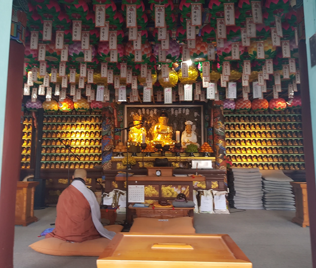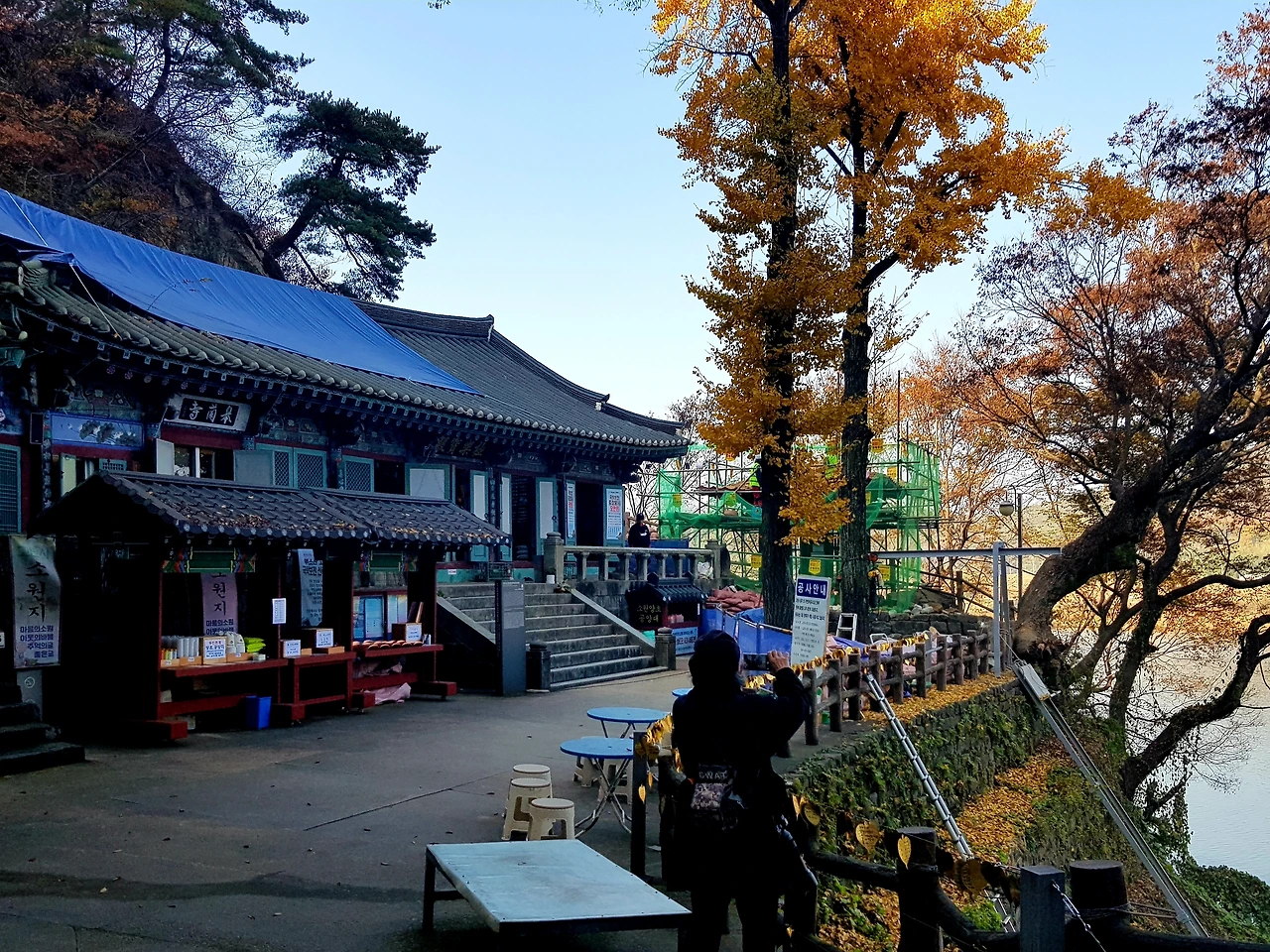 고란사 지붕은 이번 여름 긴긴 장마에 틈이 생겨 비가 샜는지 파란 고무천으로 덮어 놓았고 법당에는 스님의 염불소리가 낭랑하게 경내를 두루 살핀다