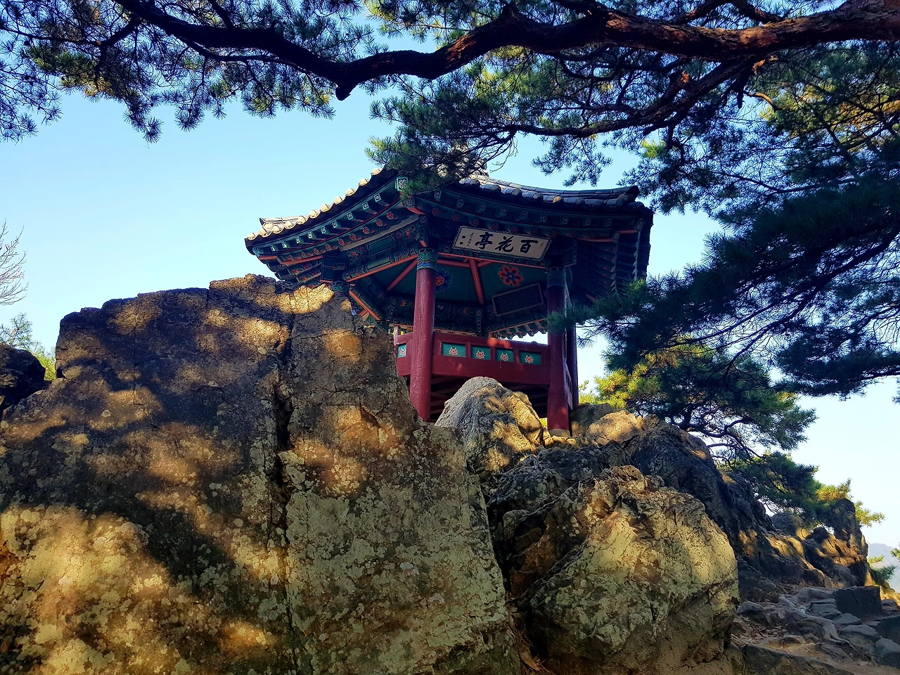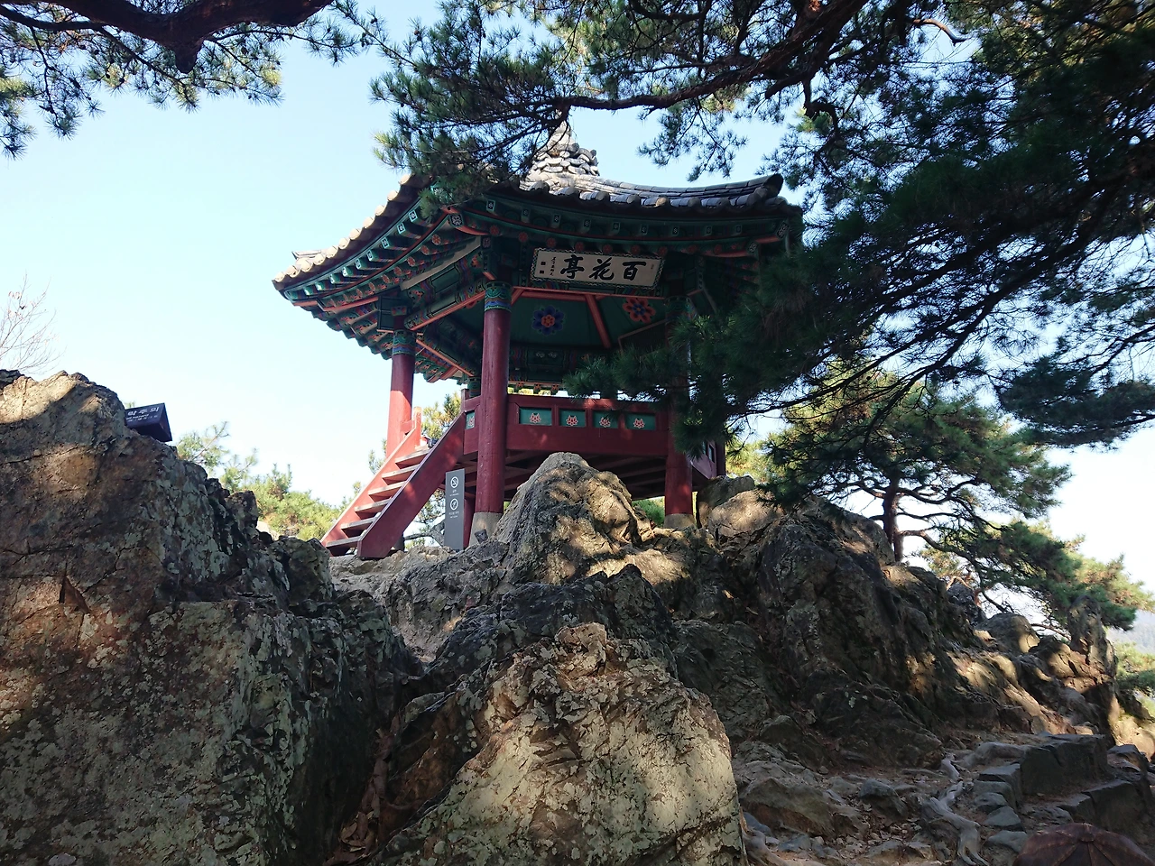 바위에 올라 다시 거의 45도 가까운 경사의 계단을 올라 백화정에 올라섰다