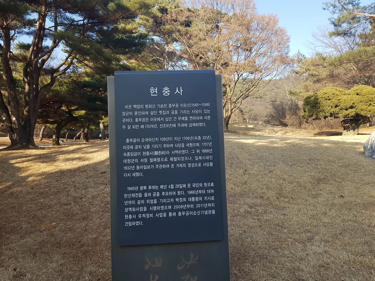 소나무 숲 옆에 현충사 입간판이 있었는데 현충사의 내력을 안내해 두었다
