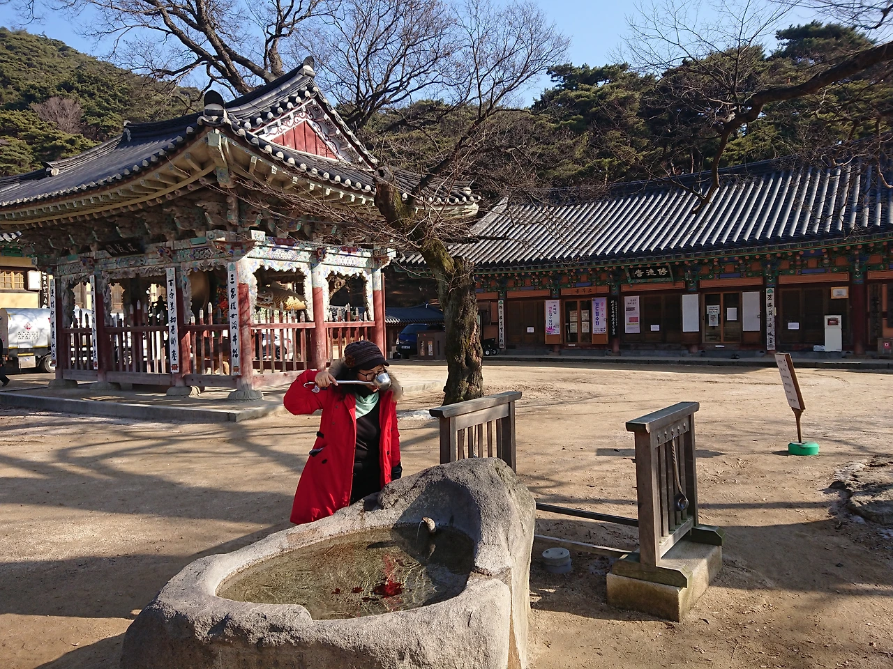 다시 마당으로 내려와 주변을 돌아보고 커다란 바위 물통에 졸졸졸 나오는 신령수? 를 그릇에 받아 짝꿍에게 주니 차가워 싫다고