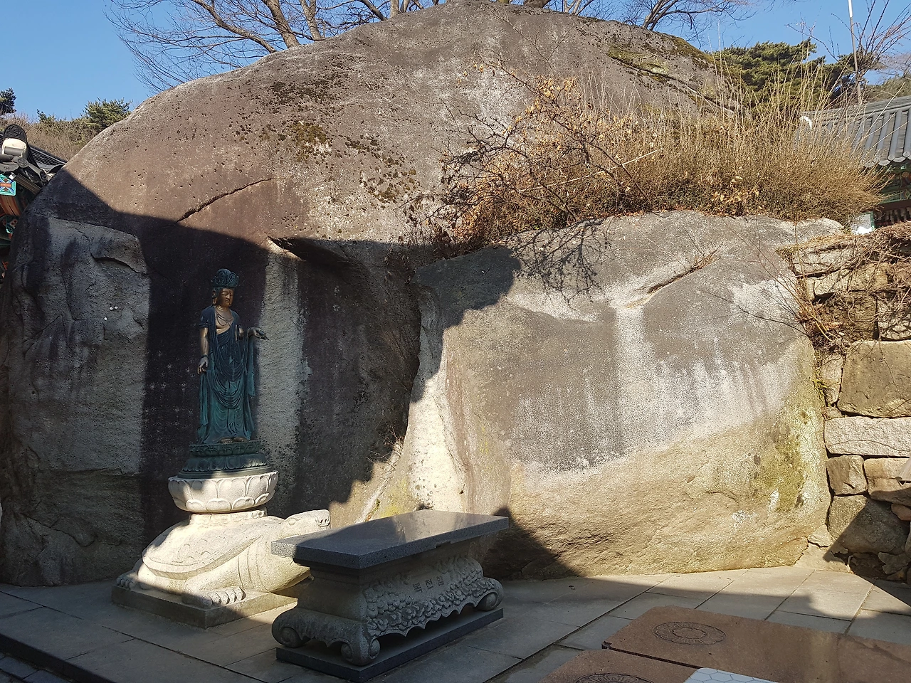 마당으로 내려가 법고각과 범종각을 돌아보고 옆길로 들어가 보니 커다란 관음바위 옆에 푸르스름한 수덕각시상이 있었고 앞에 기도의 단이 놓여 있었다