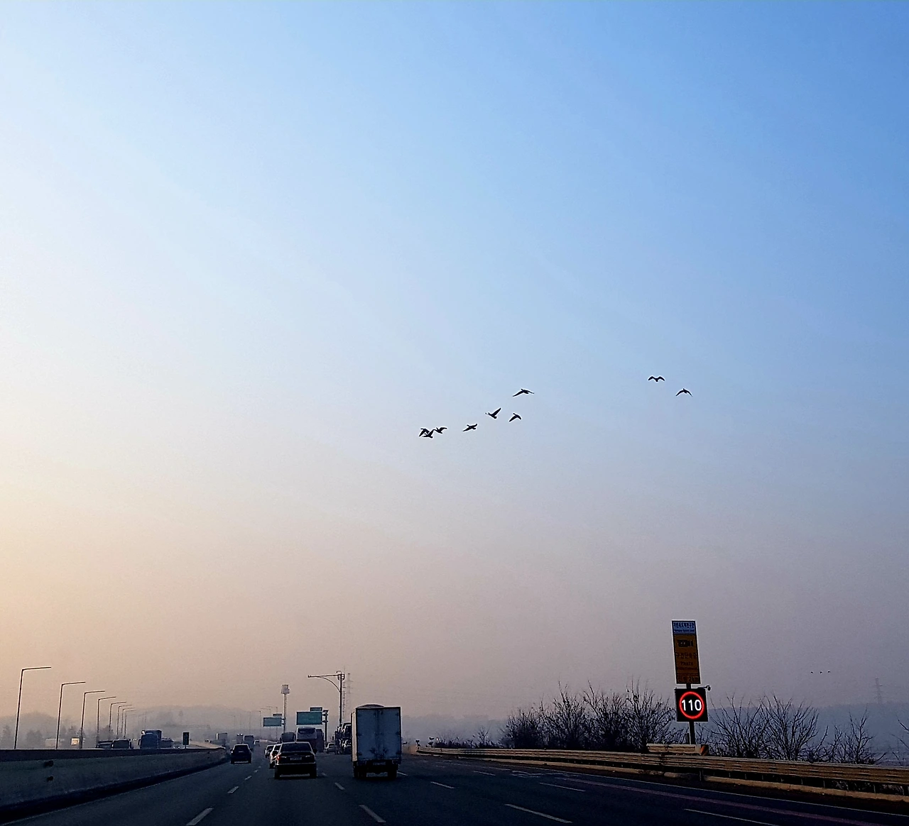 40여분쯤 더 달려가다 보니 차창밖 하늘 위로 새들의 행진이다