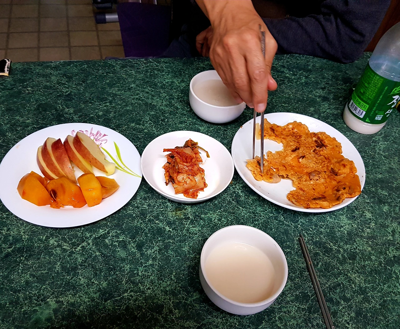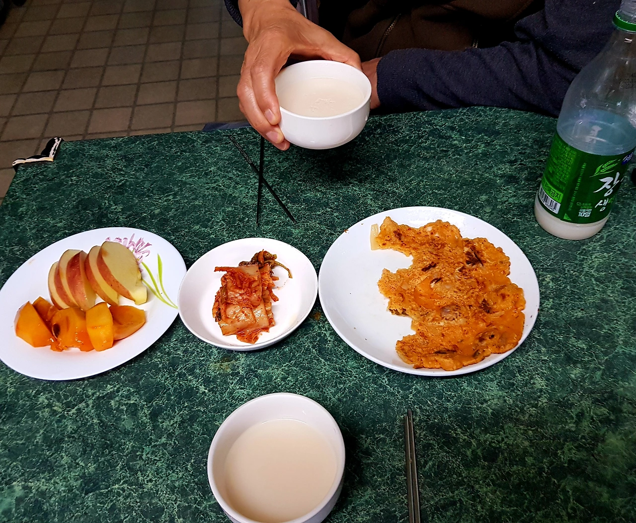 막걸리에 잔 두 개가 기다리는 식탁에 김치전이 오르고 행복한 시간여행이다